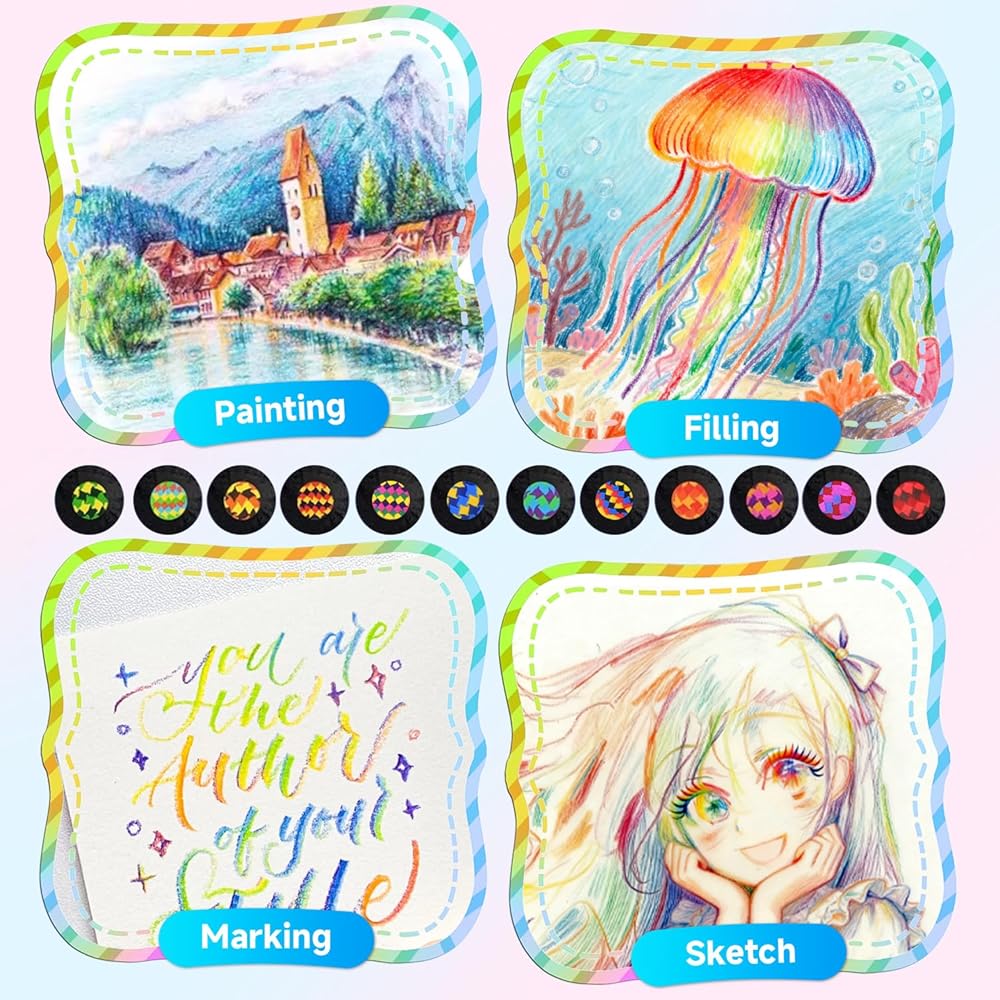 [تأثير لون فريد] - تحتوي نوى القلم الرصاص على أكثر من ثلاثة ألوان مختلفة مختلطة، ويبدو أن الألوان العشوائية تحافظ على رسمك بشعور من المفاجأة في جميع الأوقات. أقلام قوس قزح متعددة الاستخدامات في الألوان ولف الطرف للحصول على لون مختلف! يمكنك التبديل بسهولة بين الظلال لإنشاء تدرجات وتأثيرات تظليل جميلة، مما يعزز لون الرسم الخاص بك
