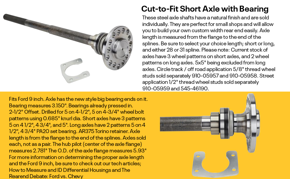 Speedway Motors Short 31-Spline 9" Ford Cut-to-Fit Axle with Bearing, Big Bearing Ends, 5-Lug Bolt Patterns, 2.5" Offset, 3.150" Bearing, Strong Steel Build, Sold Individually