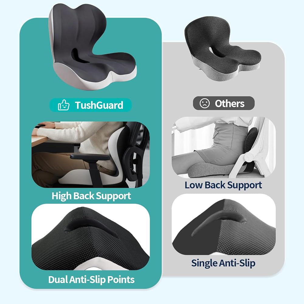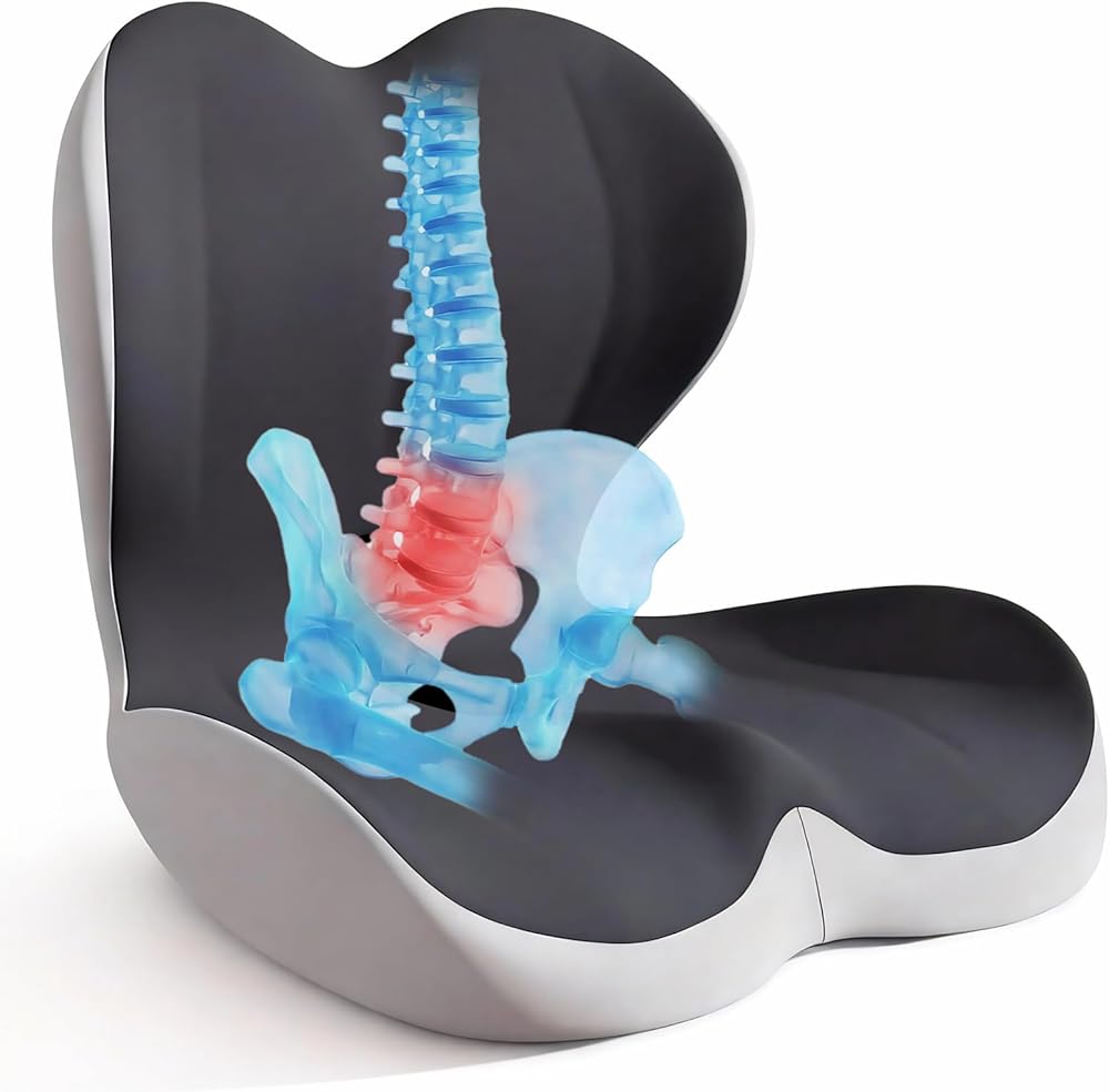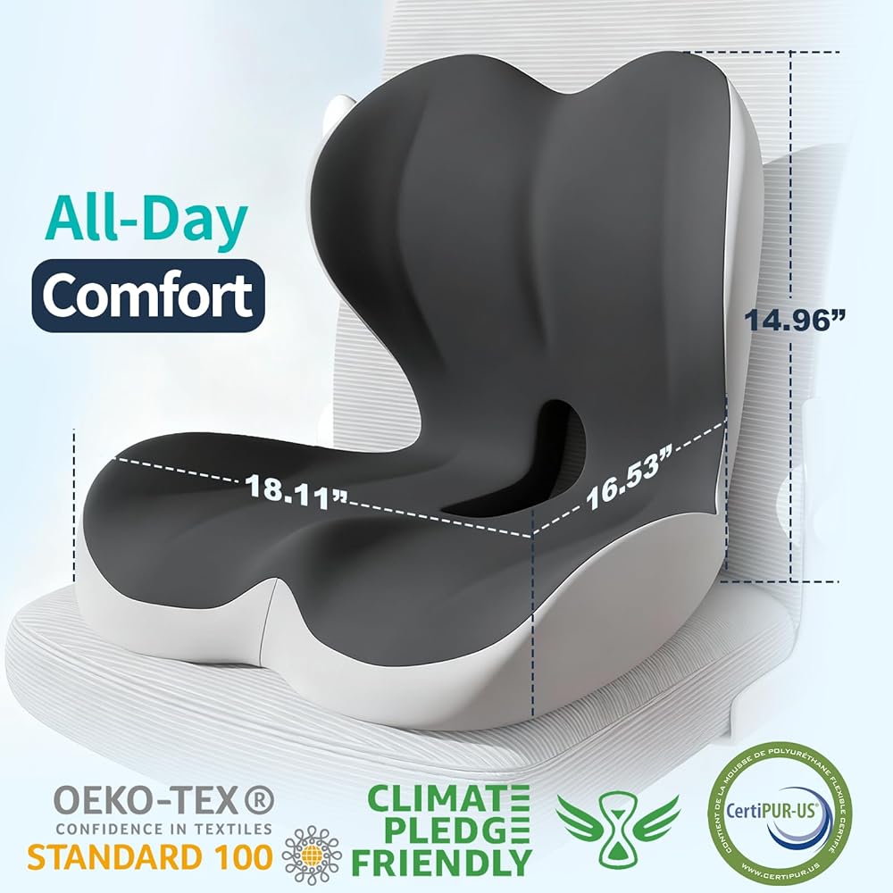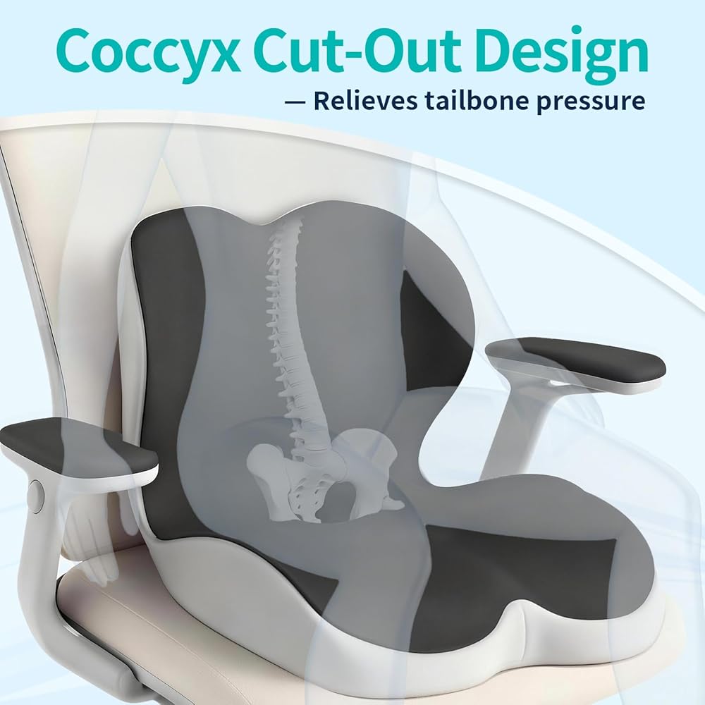تصميم مريح لتخفيف الضغط على الجسم بالكامل: عندما تجلس، ستشعر عظمة الذيل الخاصة بك كما لو أنها "تطفو" بدلاً من الضغط عليها في المقعد. تتميز هذه الوسادة بفتحة على شكل عظمة الذنب، وقاعدة موسعة، ومسند ظهر مرتفع على شكل حرف L مع دعم قطني مدمج يحتضن الوركين وأسفل الظهر، مما يساعد على تخفيف آلام عظمة الذنب وعرق النسا وآلام الظهر.