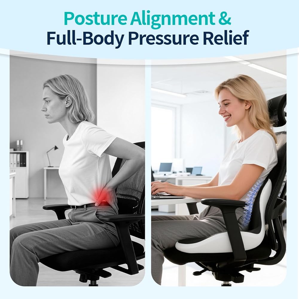 مقاس كبير لمزيد من أنواع الجسم: وسادة المقعد أعلى بحوالي 4 بوصات من الوسائد المسندة، والحجم الإجمالي 18.11 × 16.53 × 15 بوصة، مع سعة وزن تصل إلى 250 رطلاً. هذا الارتفاع الإضافي والدعم يسمحان لمنطقة أسفل ظهرك بالاسترخاء حقًا، لذلك لا يتعين عليك الاستمرار في تثبيت نفسك في وضع مستقيم