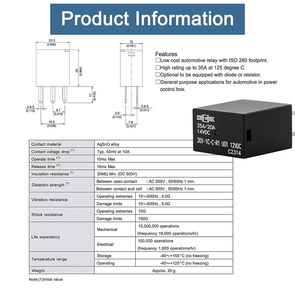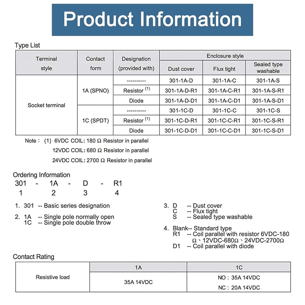 - متوافق مع الجزء رقم 301-1A-C-R1-U01 12VDC: مصمم لمرحل المروحة ومرحلات الأبواب ومرحلات الدراجة.