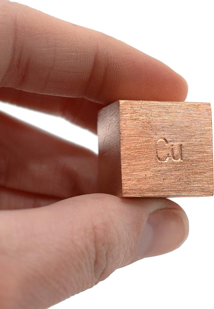 • مكعب كثافة نحاسي صلب فردي، مع ختم العنصر (Cu) لسهولة التعرف عليه