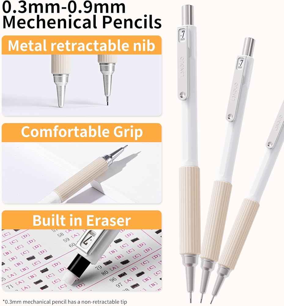 【تصميم سهل الاستخدام 】 ①سن قابل للسحب، والذي يسحب الرصاص عند عدم الاستخدام، لتجنب الإصابة (القلم الميكانيكي 0.3 مم له طرف غير قابل للسحب). ②المقود مصنوع من الراتنج والجرافيت، وهو أكثر متانة وليس من السهل كسره. ③توفر الممحاة عمليات مسح نظيفة ودقيقة مع الحد الأدنى من الحطام للحصول على مساحة عمل خالية من الفوضى.
