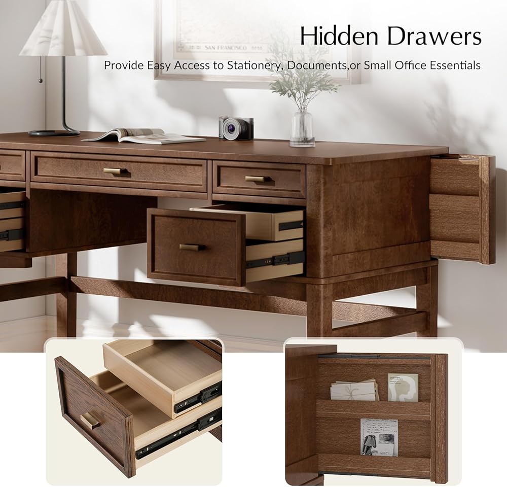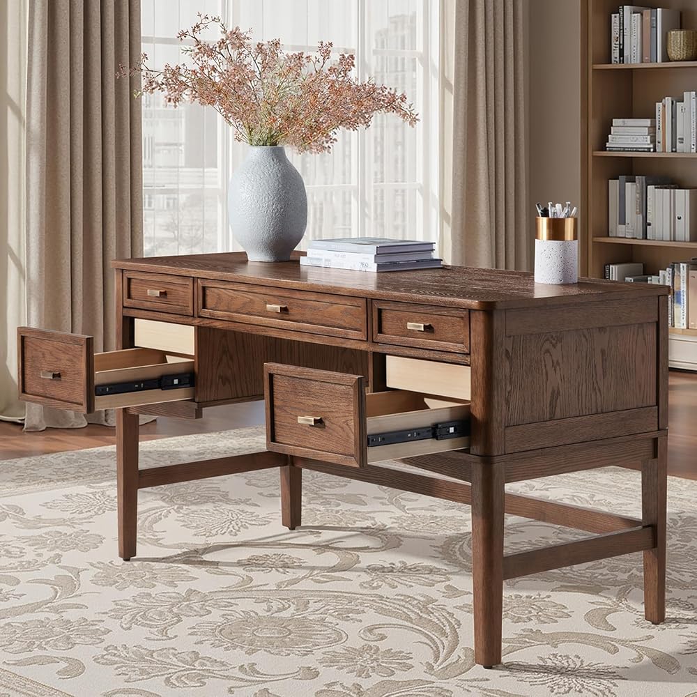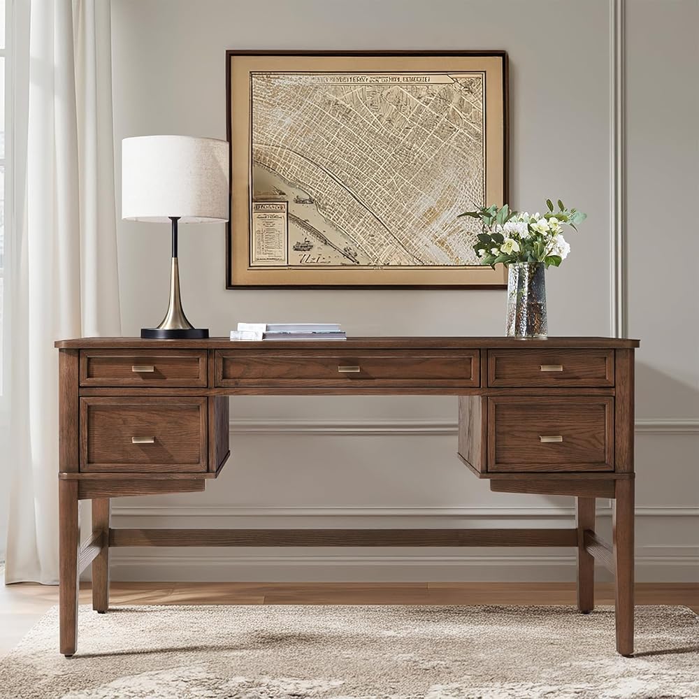 HULALA HOME 56" Home Office Desk with 5 Drawers and Hidden Compartment Drawer, Mid-Century Modern Computer Desk with Solid Wood Legs, Executive Desk for Work Study Writing, Oak