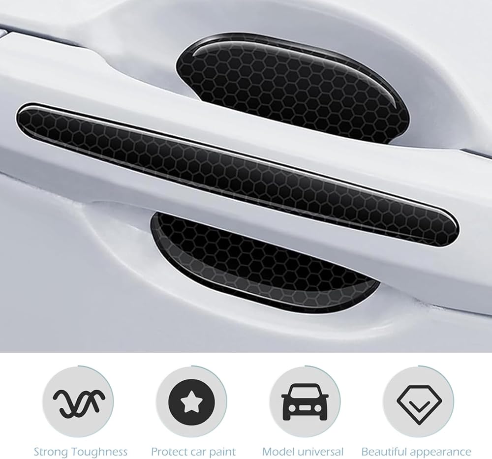 Anti-Scratch Design: Reduces door handle paint damage from daily contact, accidental collisions, and friction. The colorful laser reflective design enhances vehicle recognition as a decoration while blocking stain adhesion, making door handle cleaning quick and easy.