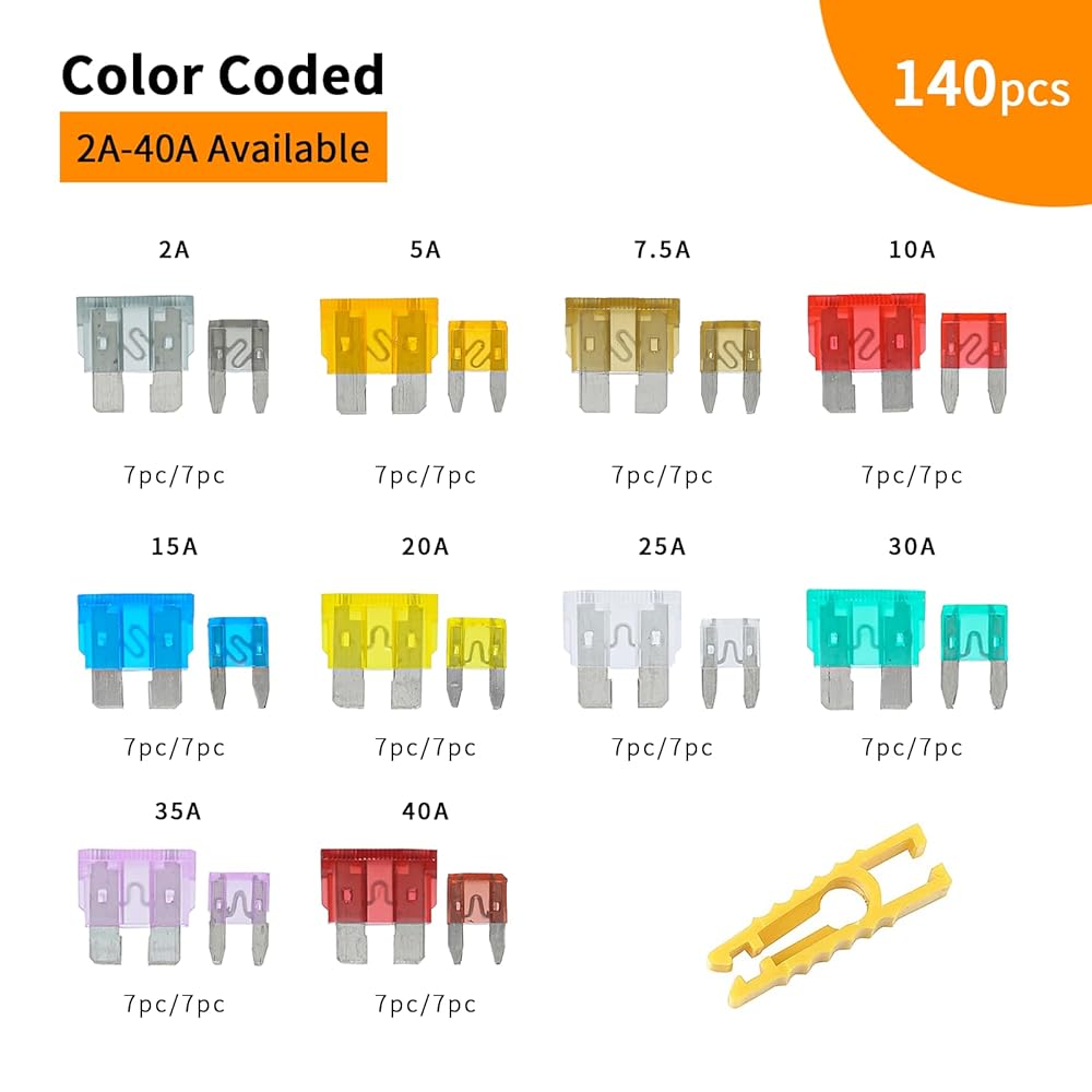 مجموعة مصهر السيارة 140 قطعة - تشكيلة مصهر السيارات ذات الشفرات القياسية ومصهر السيارة الصغير للبحرية، RV، التخييم، القارب، الشاحنة (2A 5A 7.5A 10A 15A 20A 25A 30A 35A 40A)