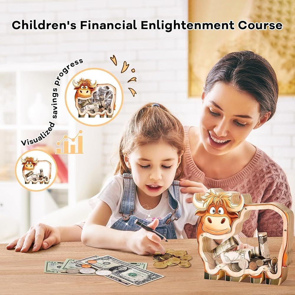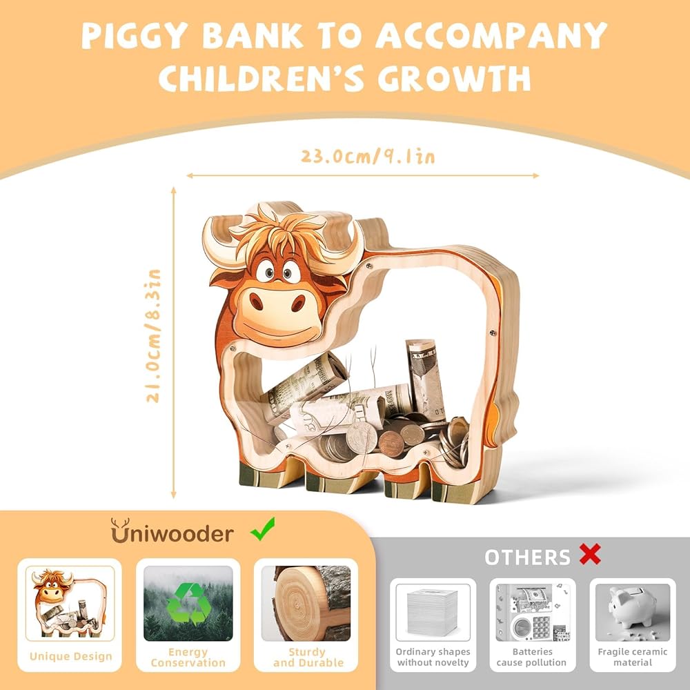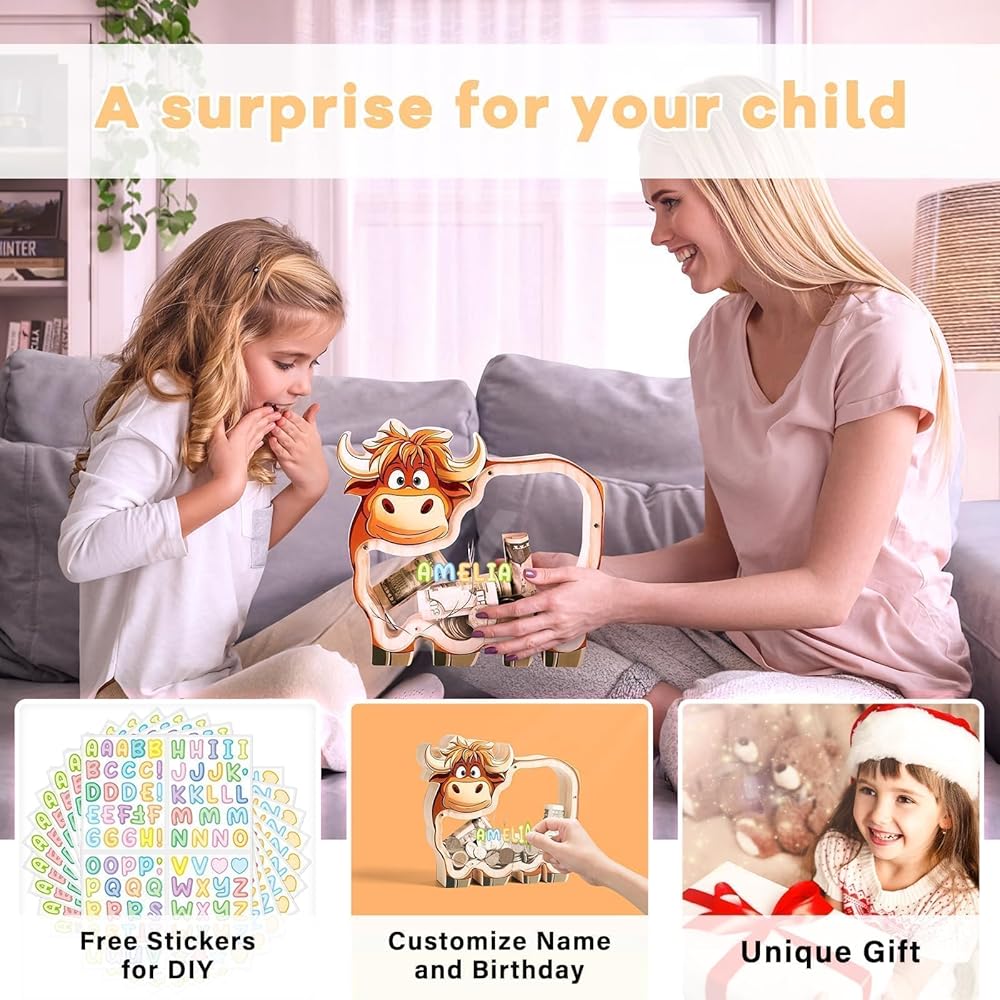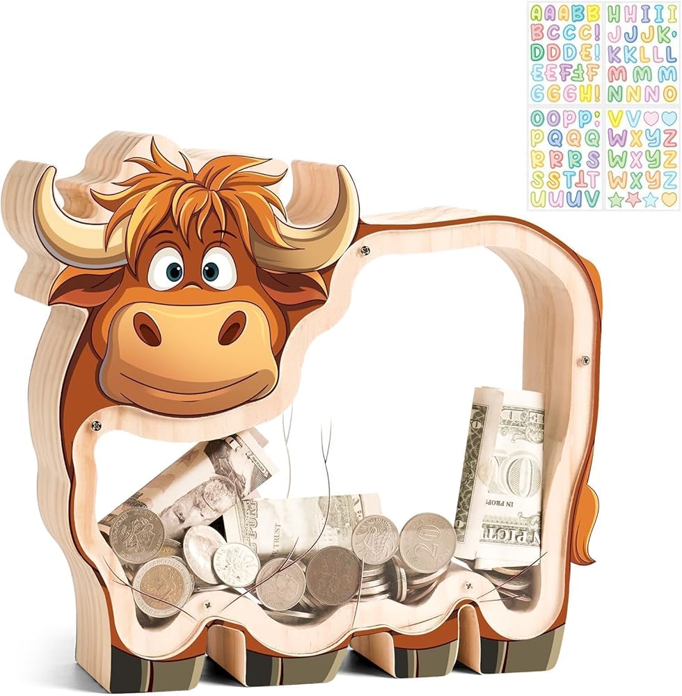 بنك خشبي على شكل بقرة هايلاند للأطفال، بنك عملات ماشية غير قابل للكسر للأطفال مع ملصق، جرة نقود خشبية، هدايا عيد ميلاد قابلة للتخصيص، لعبة تعليمية للأولاد والبنات