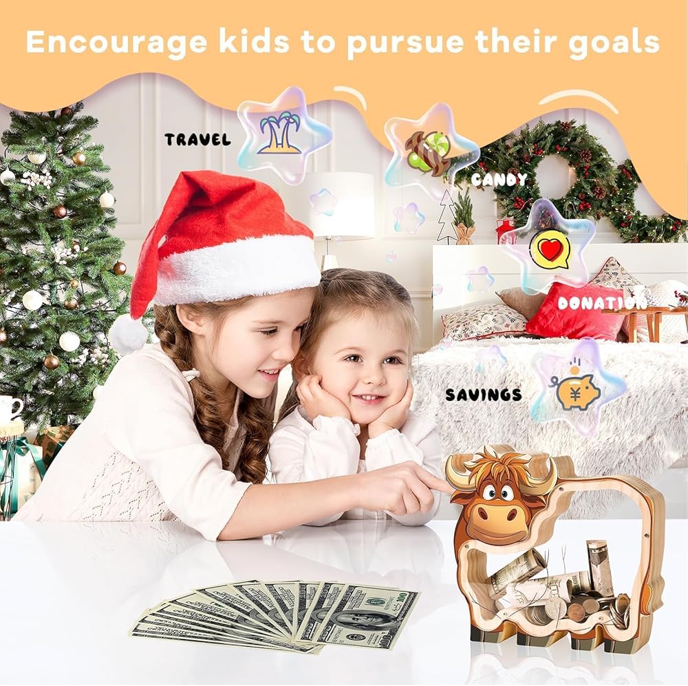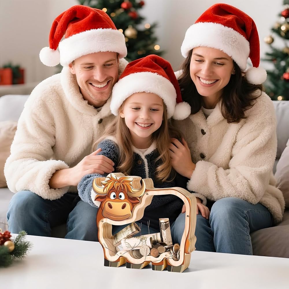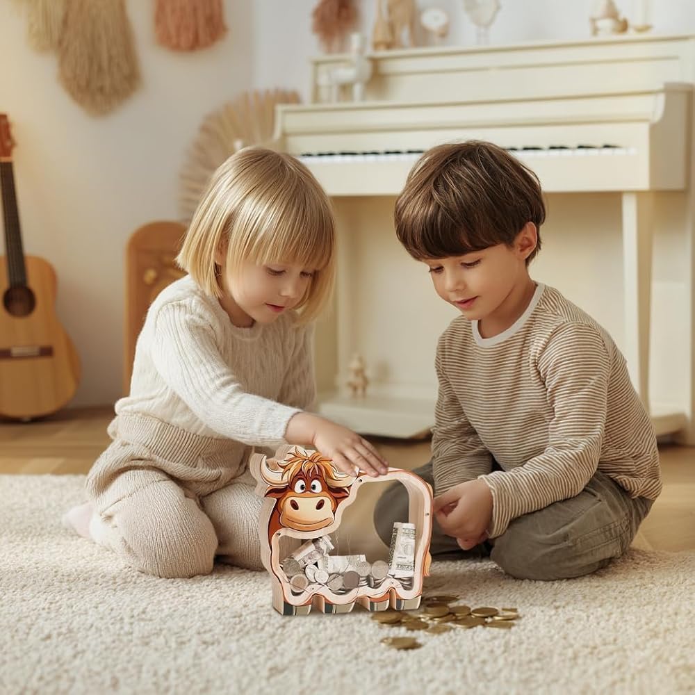 بنك خشبي على شكل بقرة هايلاند للأطفال، بنك عملات ماشية غير قابل للكسر للأطفال مع ملصق، جرة نقود خشبية، هدايا عيد ميلاد قابلة للتخصيص، لعبة تعليمية للأولاد والبنات