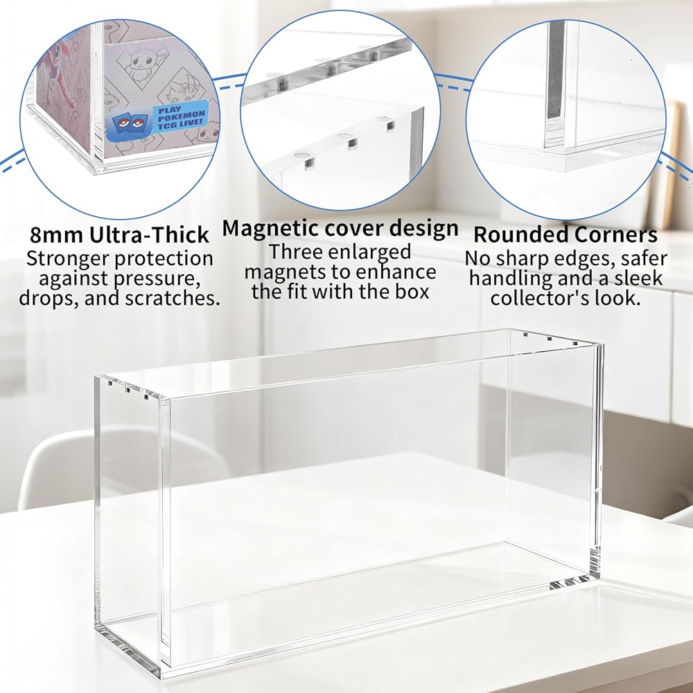Durable Magnetic Lid: Featuring a robust construction with 8mm and 5mm thick acrylic walls, this Booster Box protector with lid is reinforced with multiple 5x3mm strong magnets. The magnetic closure provides secure sealing while offering effortless opening and closing, perfectly balancing durability and convenience