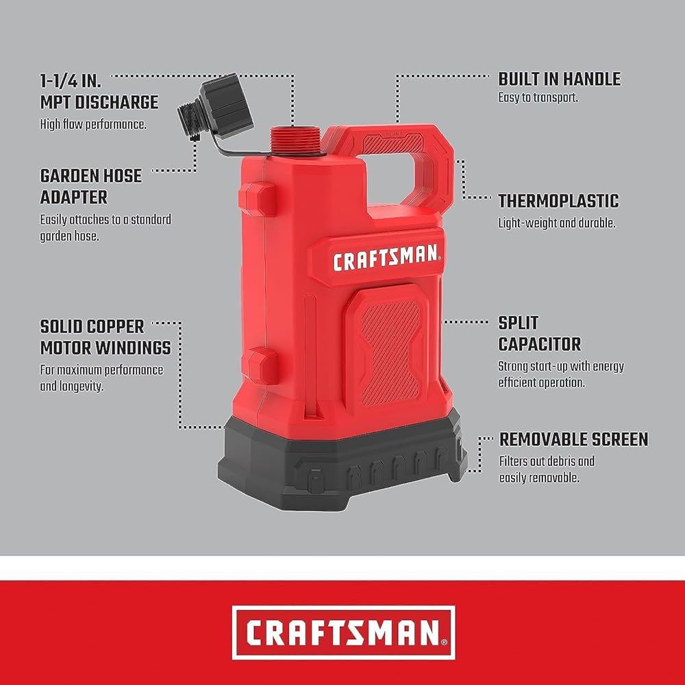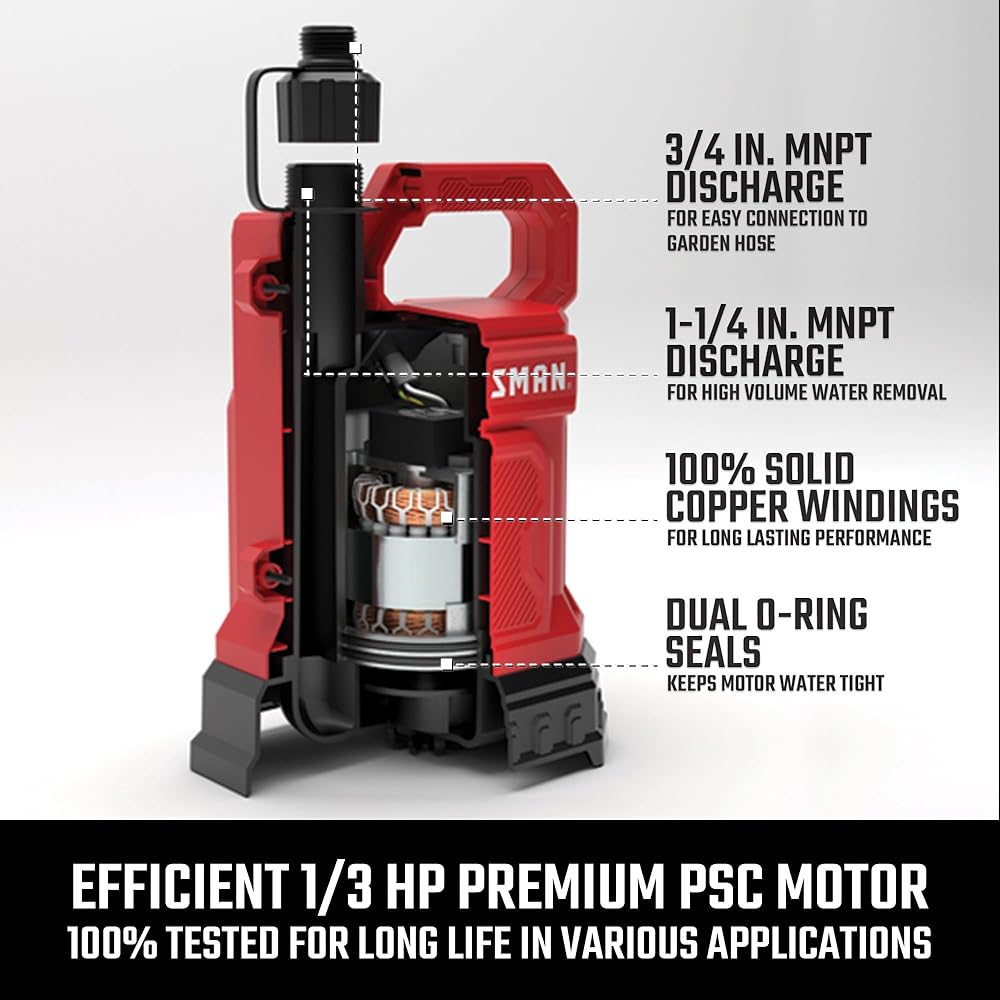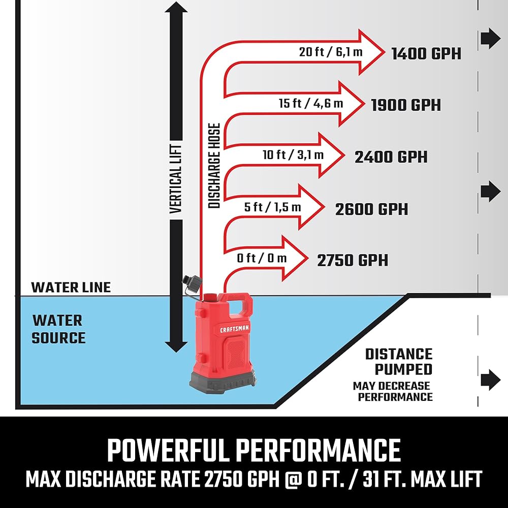• تضخ ما يصل إلى 3000 جالون في الساعة وما يصل إلى أقصى رفع رأسي يبلغ 33 قدمًا.