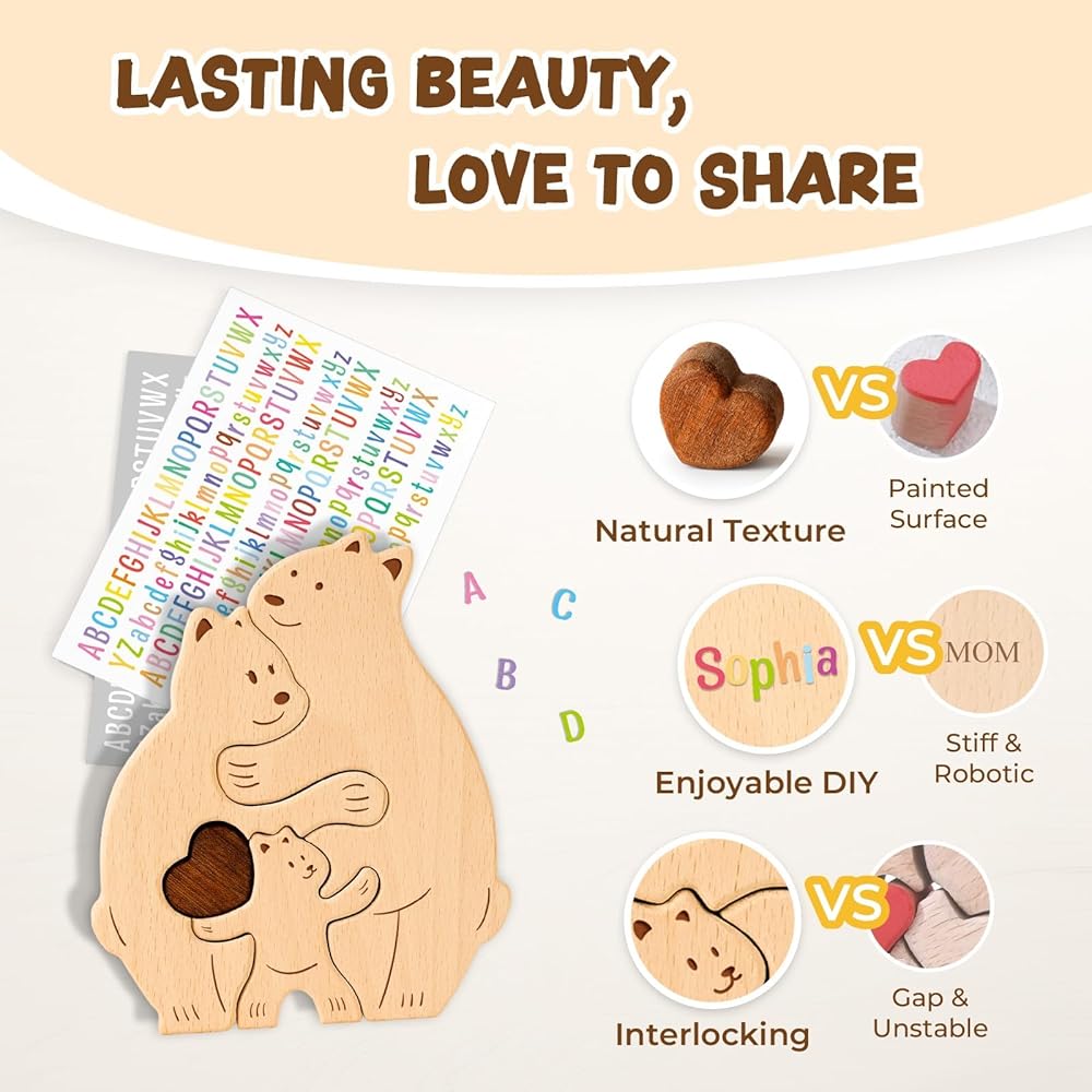 مثالية للترابط العائلي - هذه الأحجية ليست فقط قطعة زخرفية جميلة ولكنها أيضًا ألعاب عائلية للأطفال والكبار. إنها طريقة رائعة لقضاء وقت ممتع مع أطفالك الصغار، حيث يعملون جنبًا إلى جنب معك لتجميع عائلة الدب. ولجعلها أكثر تميزًا، تتضمن المجموعة ملصقات حروف ملونة وبيضاء، مما يسمح لك بتخصيصها بأسماء أو كلمات ذات معنى. أنشئ تذكارًا فريدًا أثناء الاستمتاع بتجربة الترابط الممتعة والتفاعلية