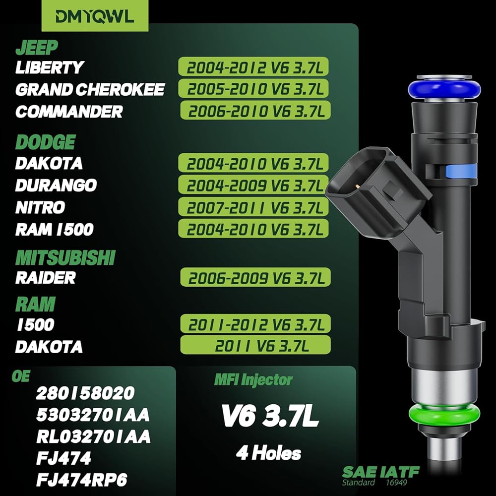 حاقن الوقود V6/3.7L متوافق مع جيب ليبرتي (2004-2012)، Ram1500 (2004-2012)، كوماندر (2006-2010)، جراند شيروكي (2005-2010)، داكوتا (2004-2011)، استبدال 4 فتحات # 0280158020 (6 قطع)