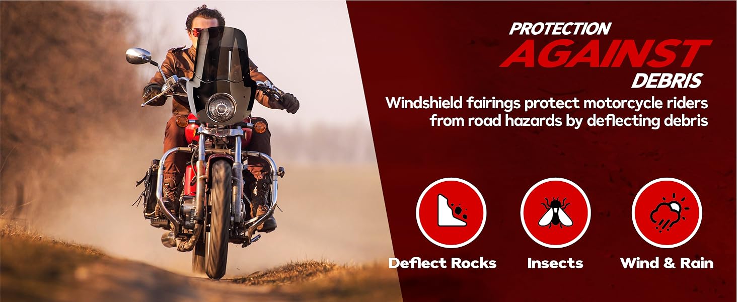 [يحمي من حطام الطريق] تحمي أغطية الزجاج الأمامي الدراجين من الحطام من خلال المساعدة في تشتيت الصخور والحشرات ومخاطر الطريق الأخرى بعيدًا عن الدراجة النارية. عند السرعات العالية، تتجمع الحشرات على خوذتك بسرعة كبيرة وتضعف الرؤية. يعمل الزجاج الأمامي للدراجات النارية على تعزيز الديناميكيات الهوائية للمركبة، ويحمي الراكب من الرياح والأمطار، ويزيد من الرؤية في الطقس العاصف.