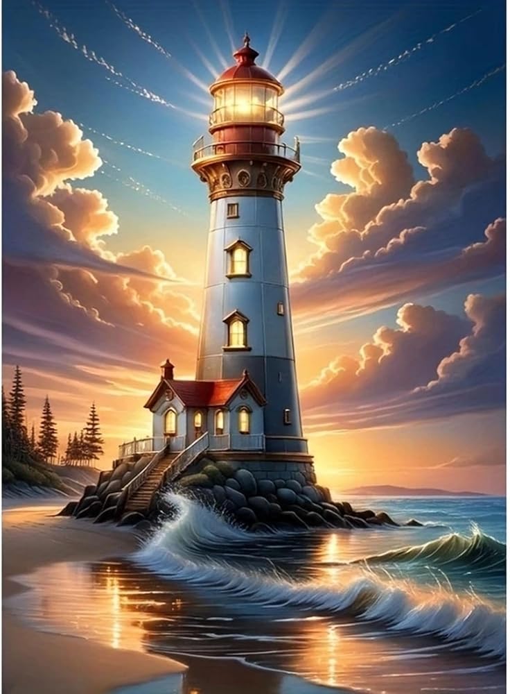 مجموعة طلاء ألماس منارة غروب الشمس من Diosedyer 5D DIY مجموعة طلاء ماسية دائرية كاملة مثالية لديكور عيد الميلاد والهالوين، مثالية لغرفة النوم، وفن جدار غرفة المعيشة 11.8 × 15.7 بوصة