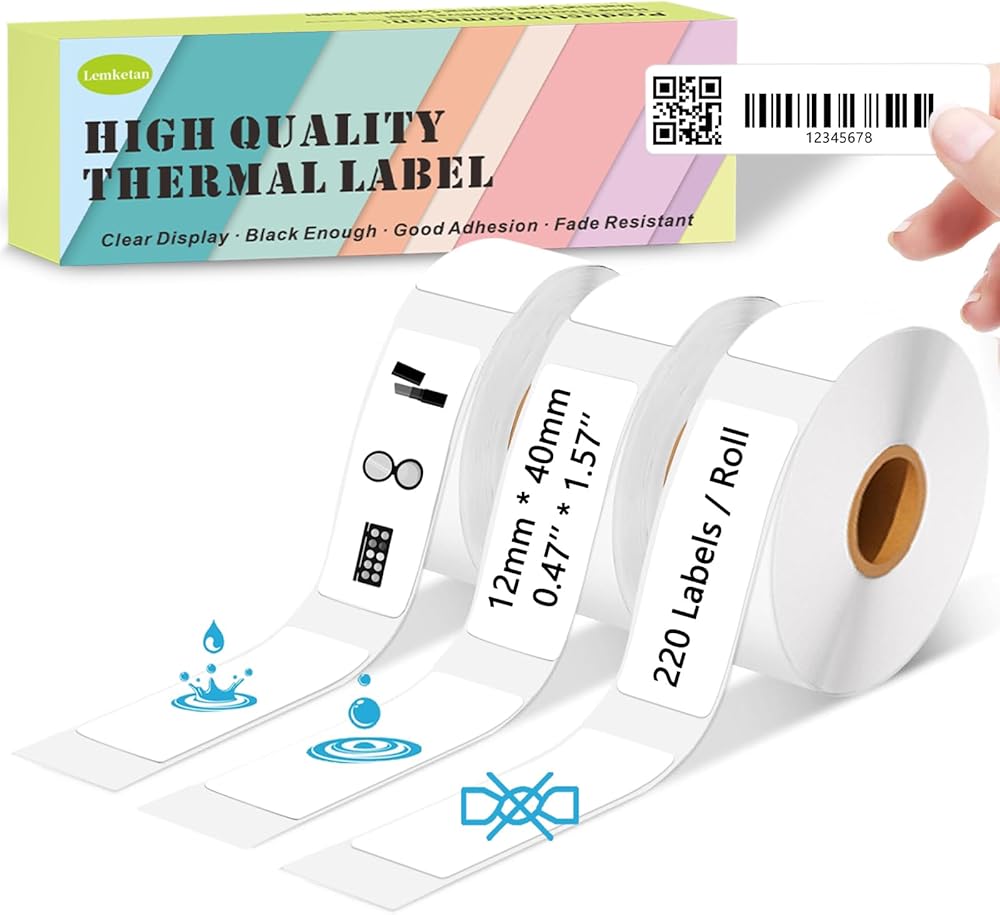• 【جودة عالية وسعة كبيرة】3 لفات ملصق حراري صناعي عالي الجودة: 12 مم × 40 مم (0.47 بوصة × 1.57 بوصة)، 220 ملصق/لفة، أسود على أبيض. عدد أكبر من التسميات.
