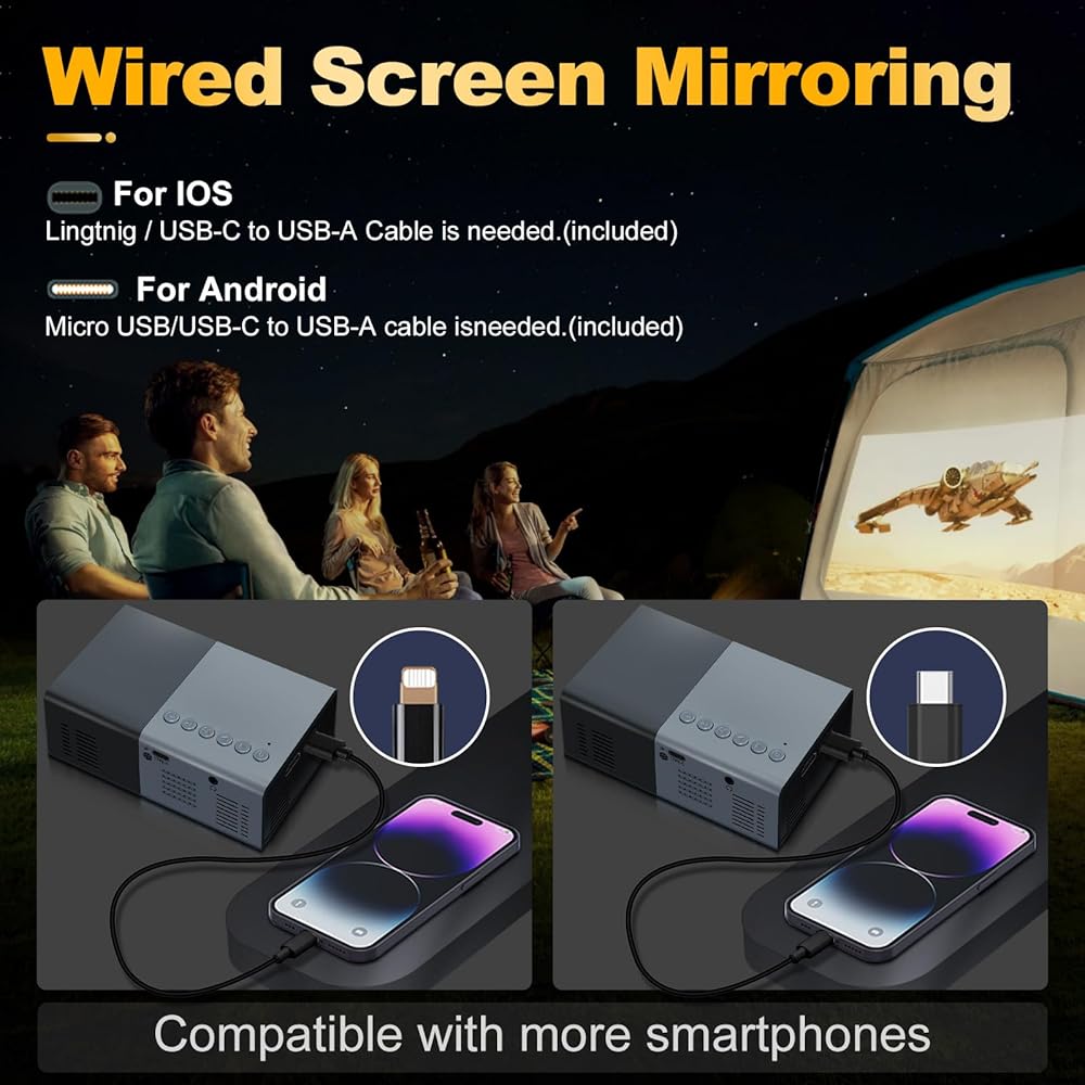 【Warm Tips】Due to HDCP (High-bandwidth Digital Content Protection) agreement, screen mirroring doesn't work (no image or sound) when you try to mirror the content from some apps ( Hulu, etc.), Please play these videos by inserting your TV Stick/Roku/Chrome-cast into our projector. You can also connect to a laptop/computer to play via HDMI Connection./or you can use a lighting to HDMI , a Micro USB to HDMI or a Type-C to HDMI adapter which depends on your ios or android devices.(Included)