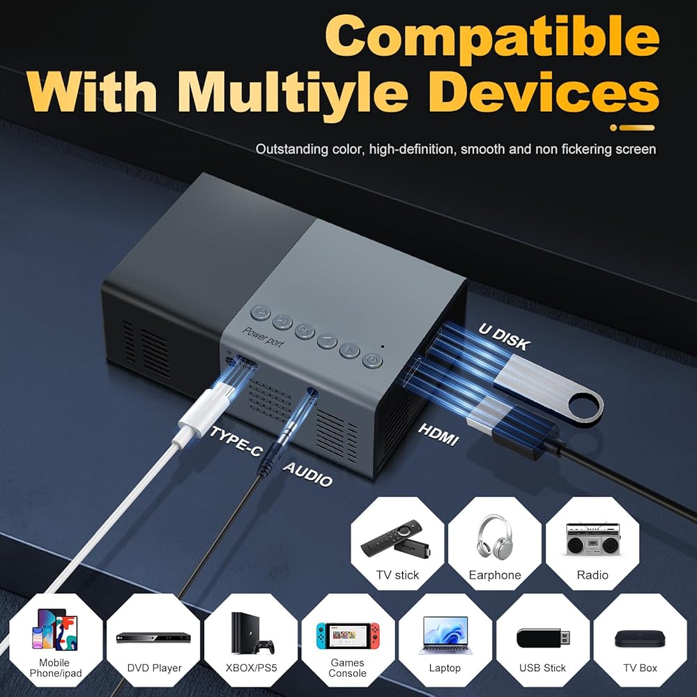 【Power supply&Mini 】 You can power the projector with just a phone charging cable. This pocket size projector is only 5.1inchx3.1inchx1.1inch (0.6 pounds), not much bigger than your smart phone. You can take it anywhere and anytime.Whether you are watching movies, playing games, or party with friends, this is your great private theater.Equipped with various ports such as USB / AV /HD Audio. It can be easily connected with your smartphone,TV Stick, PS4/5, tablet, laptop.