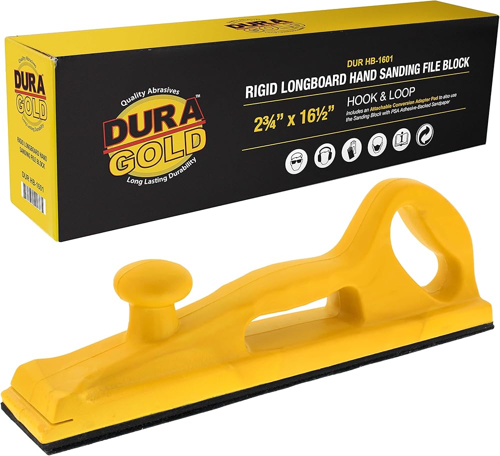 • Dura-Gold Pro Series Rigid Longboard Hand Sanding File Block. Uniquely designed hook & loop longboard hand sanding file block with a 2-way design system that allows it to be used with both hook & loop and PSA longboard sandpaper sheets or rolls. Includes an attachable PSA conversion adapter pad with a vinyl face that converts the longboard file block for use with PSA pressure-sensitive adhesive sandpaper sheets.
