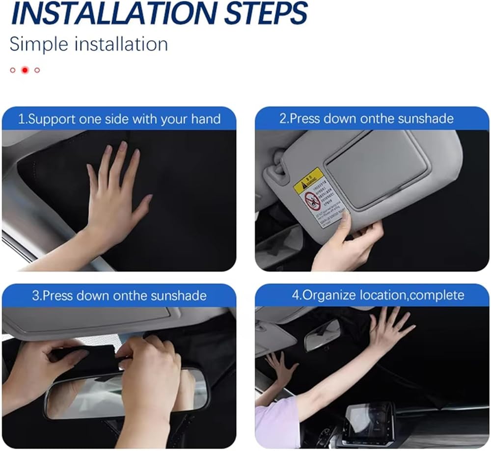Simple Installation: The installation of this Car Sun Shade Windshield is very simple. Method 1: You can use the elasticity of the sun visor and place it directly in front of the car windshield. Method 2: You can also use the two sun visors that come with the original car to press it in place