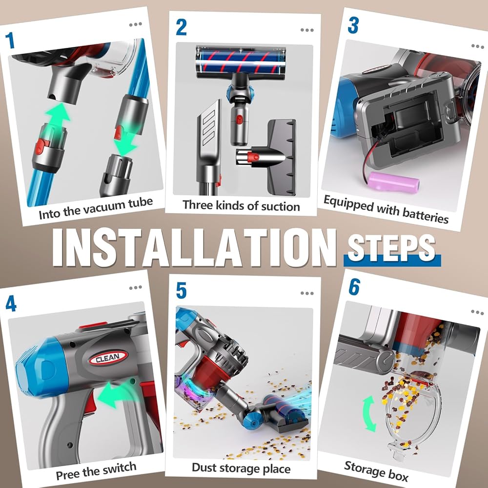 【Simulated adsorption】Our kids vacuum cleaner features a simulated suction design. While its suction power doesn't match professional cleaning equipment, its appearance and operating sounds effectively mimic real cleaning scenarios, satisfying children's role-playing needs.