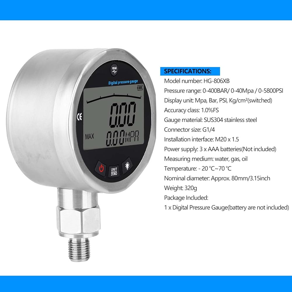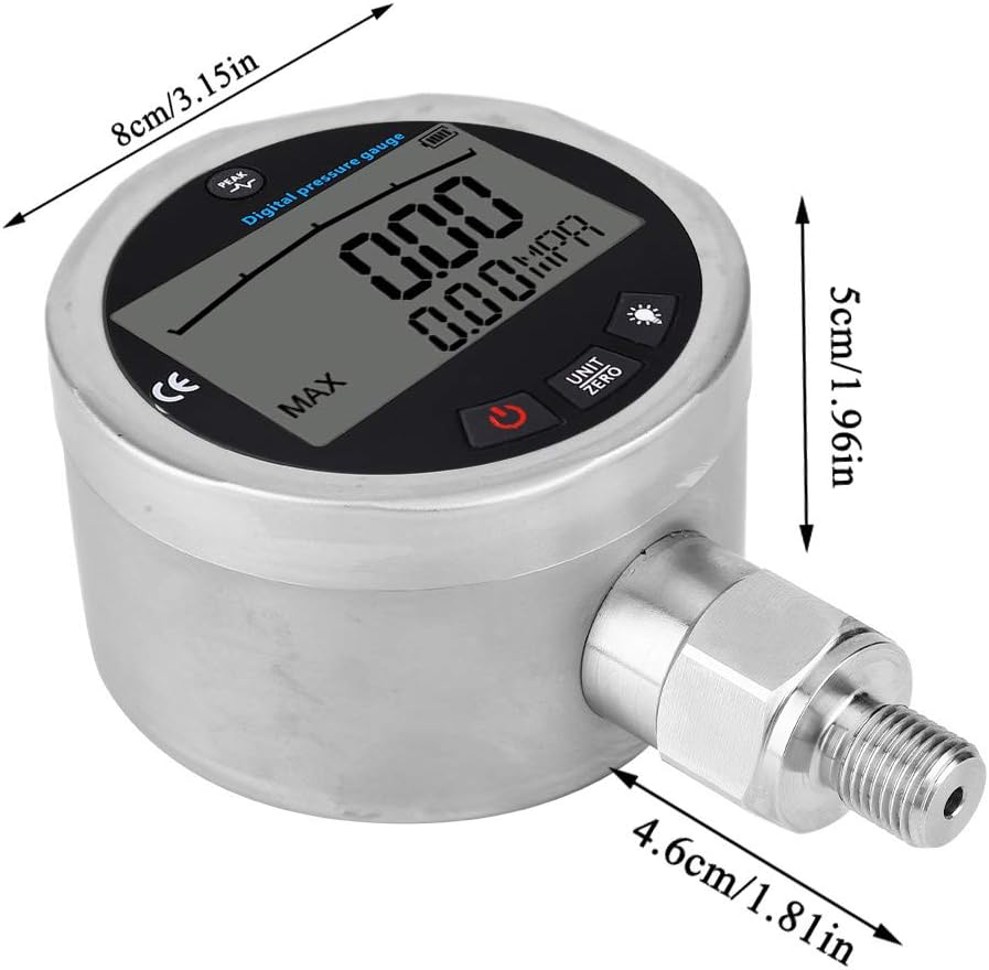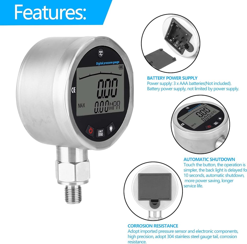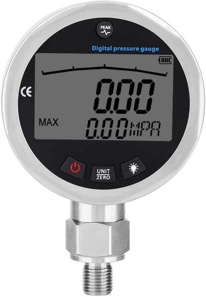 متعددة الوظائف: يحتوي المقياس الهيدروليكي الرقمي على تصميم زر لتوفير عملية أسهل لك. يعد تأخير الضوء الخلفي لمدة 10 ثوانٍ وإيقاف التشغيل التلقائي أكثر توفيرًا للطاقة. يضمن تصميم MPA/PSI/Kgf/cm2 إمكانية تبديل الوحدات المتعددة