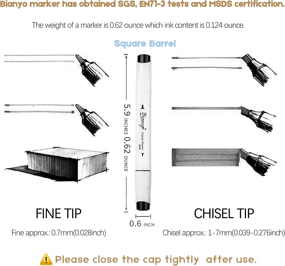 Certified Safe & Alcohol-Based Ink: Bianyo markers feature alcohol-based, low-odor ink that is SGS, EN71-3, and MSDS certified for safety. The durable chisel tip covers 328 feet, while the fine tip reaches up to 1738 feet, offering reliable performance for any artist