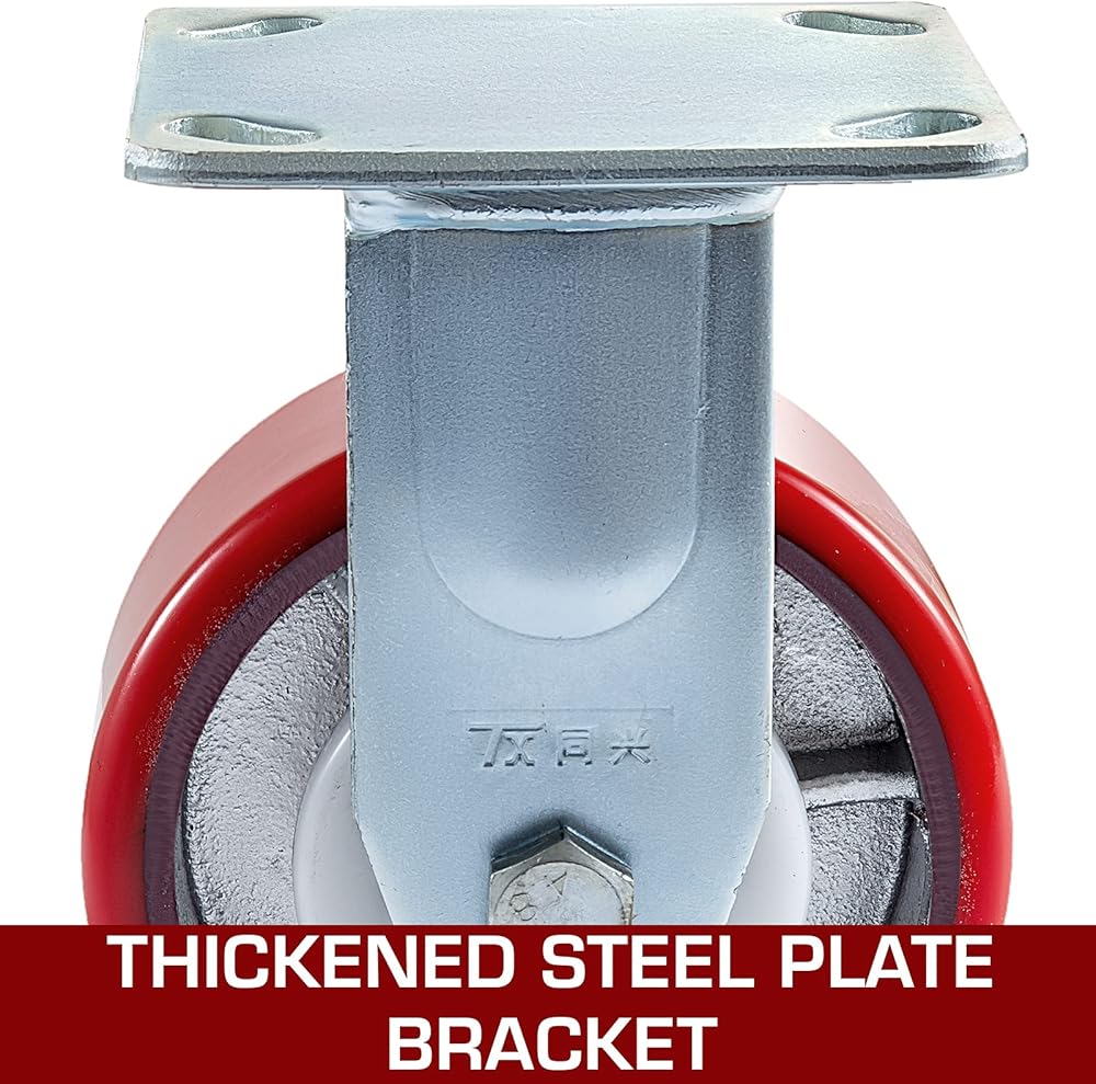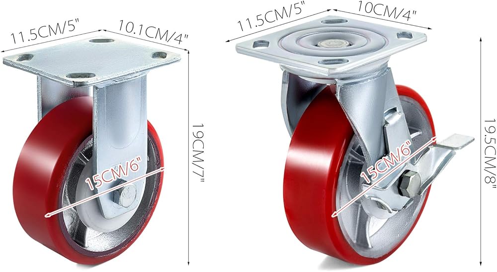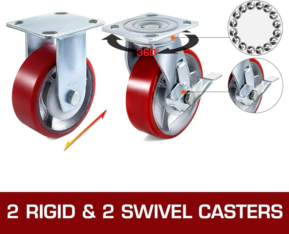 عجلات دوارة عالية الجودة من الدرجة الصناعية مصنوعة من نوع البولي يوريثين المطاطي، تدور بسلاسة وصمت على أي أرضية. يمكن قفل العجلات بواسطة الفرامل الجانبية. هيكل هيكل صلب للغاية ومقاوم للأوساخ. سعة 1000 باوند لكل عجلة. يمكن أن توفر حركة فورية للأشياء الثابتة في ورشة العمل والمرآب والمستودع والمطبخ والمكاتب وأكثر من ذلك بكثير.