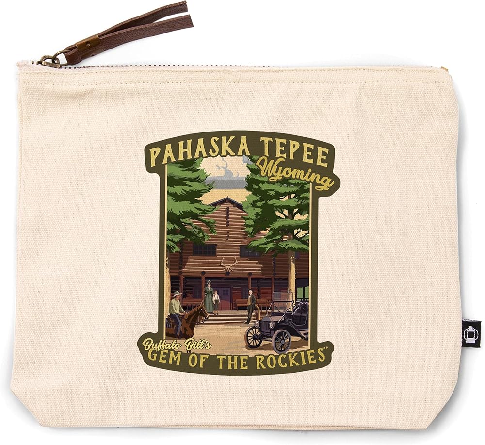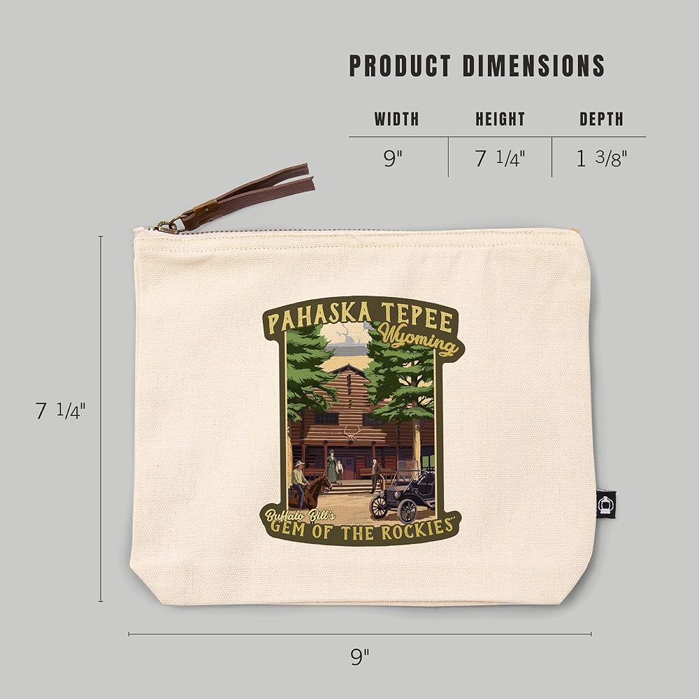 This original, high-quality cotton Zipper Pouch from Lantern Press boasts sharp detail and vivid imagery of Cody, Wyoming, Pahaska Tepee, Vintage Cabin Scene, , 100% Cotton Zipper Pouch, Travel Accessory, Go Bag.