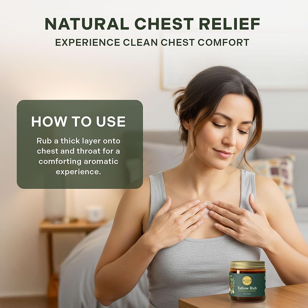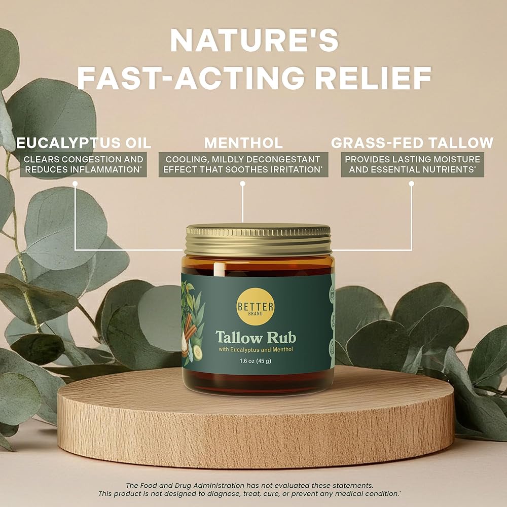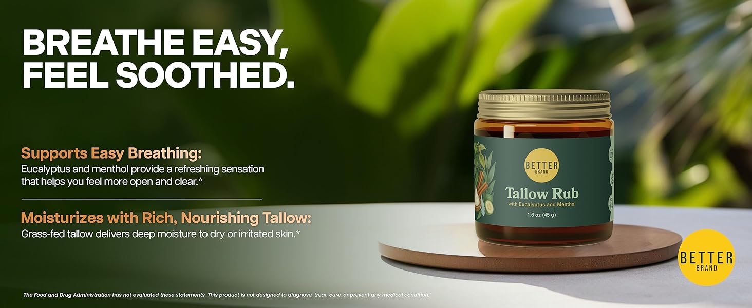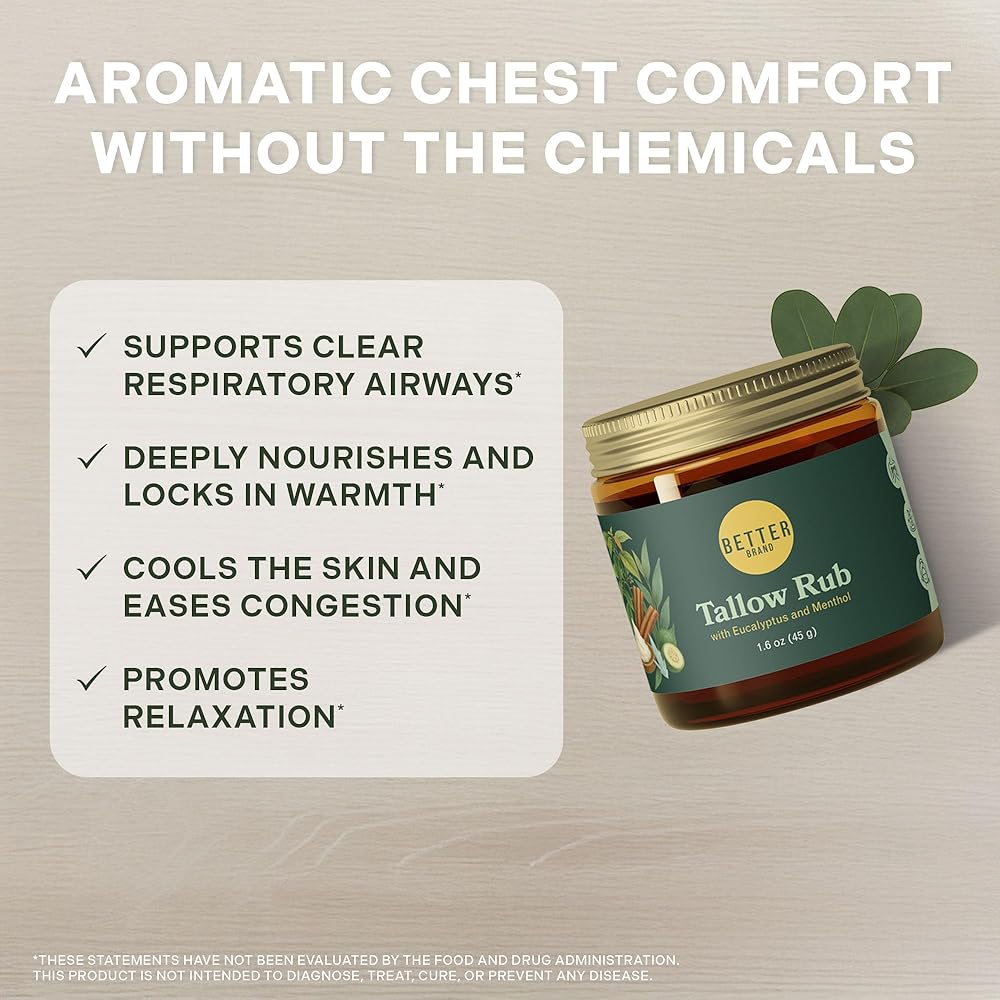 فرك الشحم الطبي الخالي من البترول من Betterbrand - بديل فرك البخار الطبيعي مع المنثول والأوكالبتوس - بلسم الشحم الذي يتغذى على العشب لتخفيف احتقان الصدر - صنع في الولايات المتحدة الأمريكية - 1.6oz