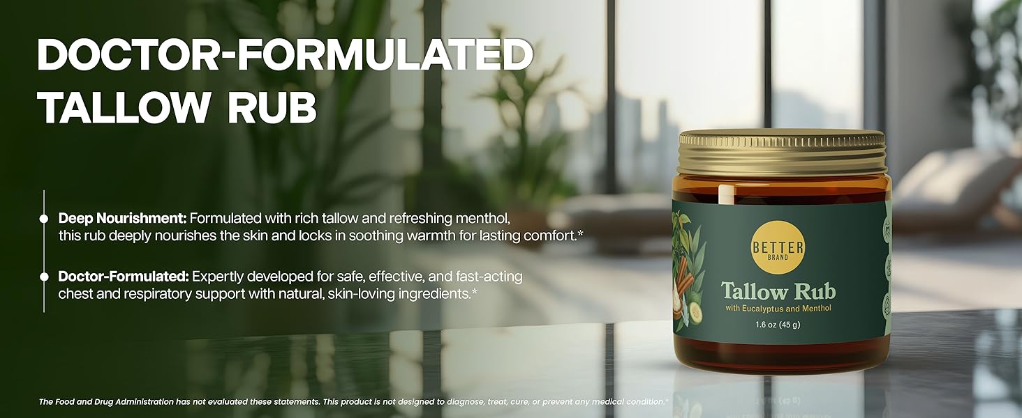 راحة عطرية مناسبة للعائلة: مع رائحة لطيفة وملمس ناعم، يعتبر TallowRub آمنًا ومهدئًا لجميع أفراد الأسرة. ضعيه على الصدر أو الظهر لدعم الاسترخاء وراحة التنفس. توفر قاعدة بلسم الشحم رطوبة ودفء دائمين دون ترك بقايا ثقيلة من التدليك التقليدي.