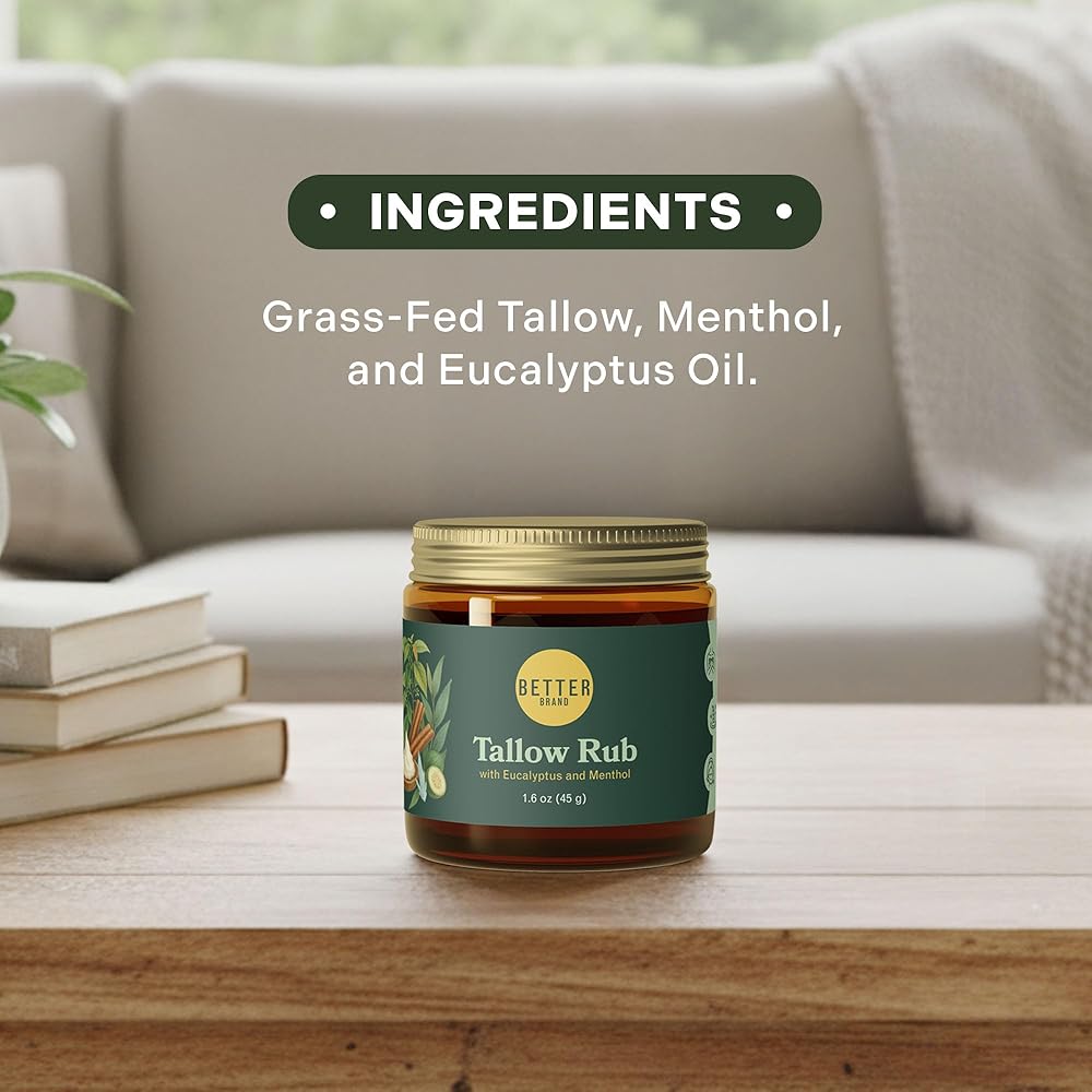 الشحم العشبي للبشرة والدفء: مصنوع من شحم البقر الذي يتغذى على العشب والغني بالفيتامينات A وD وE وK، هذا البلسم يرطب بعمق بينما يحافظ على الدفء اللطيف. على عكس الفازلين، فإنه يدعم البشرة الصحية والاستخدام السلس - مثالي لتهدئة الصدر والظهر أو العضلات الملتهبة بشكل طبيعي.