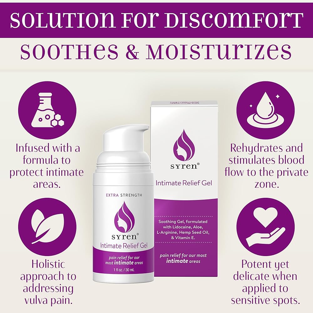 • يوصى به OBGYN: يساعد Syren Intimate Relief على تهدئة البشرة الجافة الناجمة عن انقطاع الطمث والتغيرات الهرمونية الأخرى، ودعم ما بعد الولادة، والاحتكاك، والتهيج الكيميائي، والتزيين وأكثر من ذلك، بالإضافة إلى تقليل الجفاف والاحمرار والحكة والانزعاج العام.