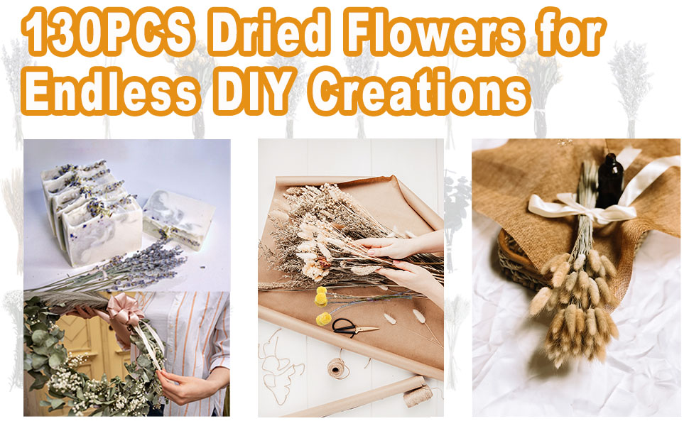 12 Kinds of High-Quality Flowers: Dried flower set contains 20 lavender, 5 dried golden globe, 10 dried yellow rose, 10 wheat, 10preserved green leaf, 10 preserved rice flower, 10 rabbit's tail, 10 gem grass, 10 pineapple daisy, 5 eucalyptus, 10 baby's breath, and white sweetheart,a total of 130 pieces.