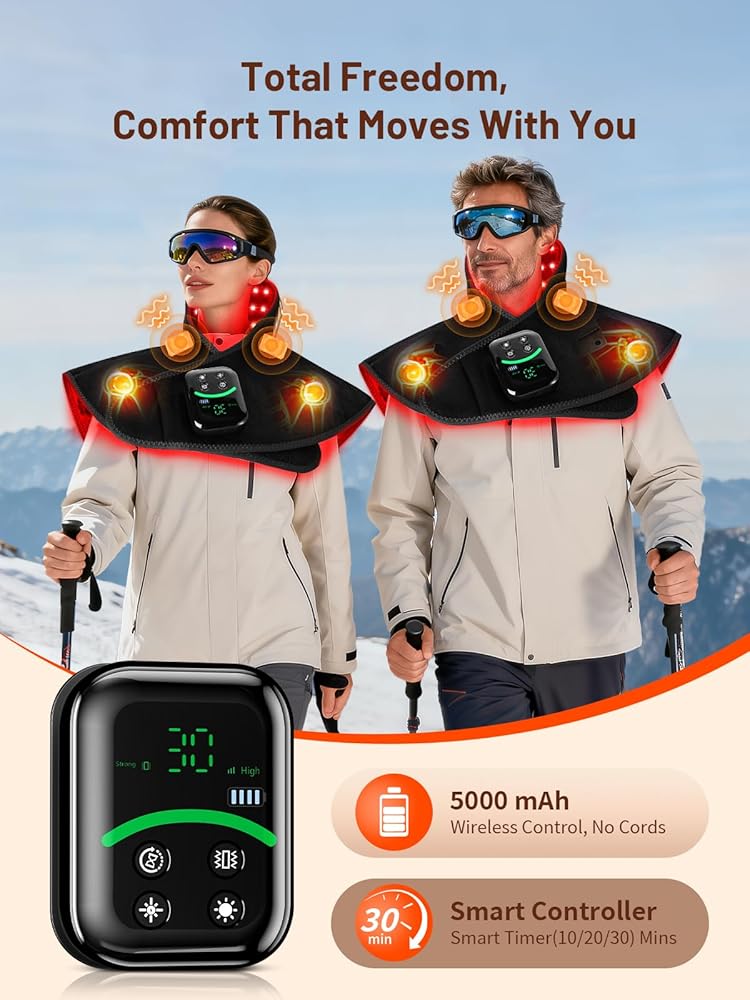 العلاج بالضوء الأحمر اللاسلكي للرقبة والكتف مع الحرارة والتدليك، وحدة تحكم 5000 مللي أمبير في الساعة 118 مصباح LED 3 في 1 رقاقة 660 نانومتر و850 نانومتر وسادة العلاج بالضوء بالأشعة تحت الحمراء للجسم للاستخدام المنزلي في الهواء الطلق