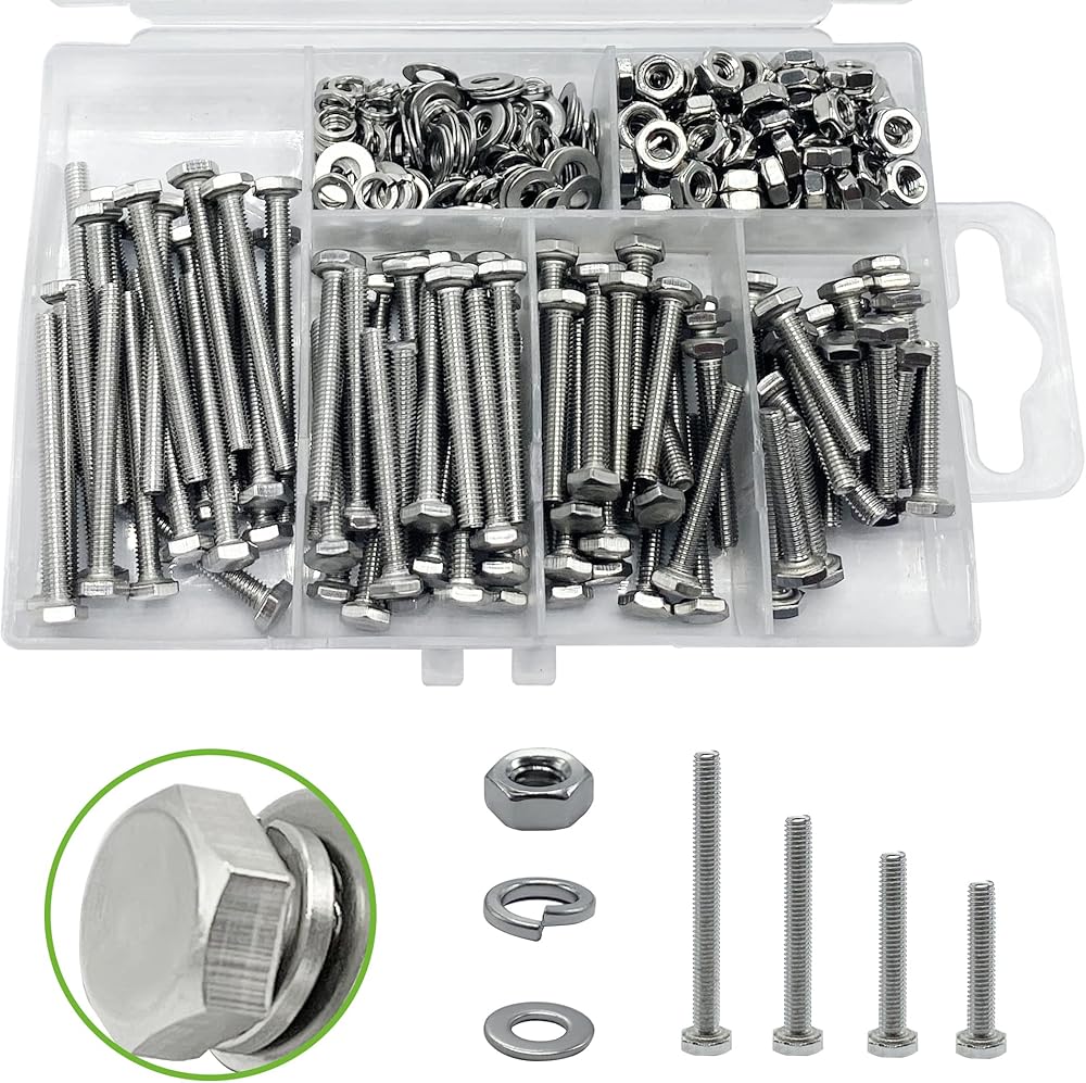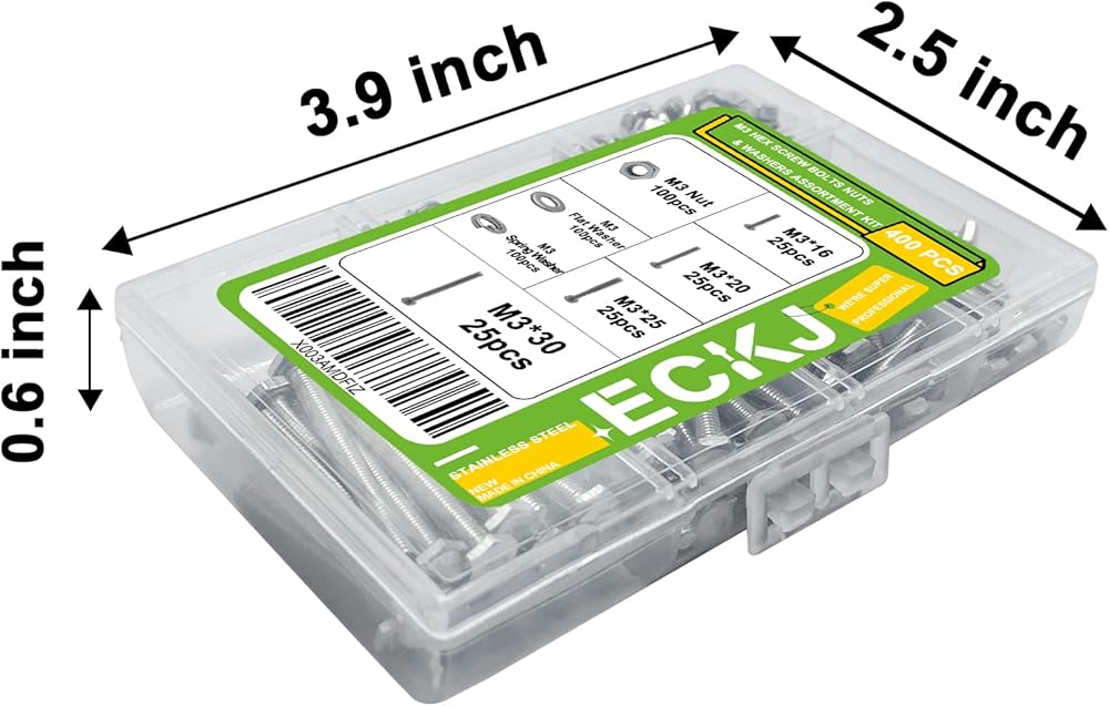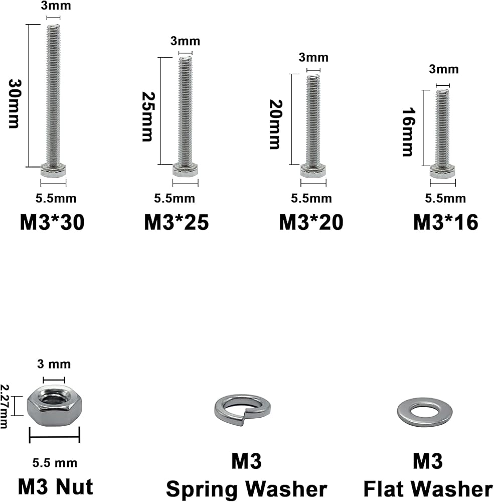 تشمل --- قطر خيط مسامير M3: 3 مم؛ طول المسمار: 16 مم (25 قطعة)، 20 مم (25 قطعة)، 25 مم (25 قطعة)، 30 مم (25 قطعة). غسالات مسطحة وزنبركية M3، صواميل سداسية M3. مجموعة البراغي السداسية المترية تحتوي على 400 قطعة إجمالاً.
