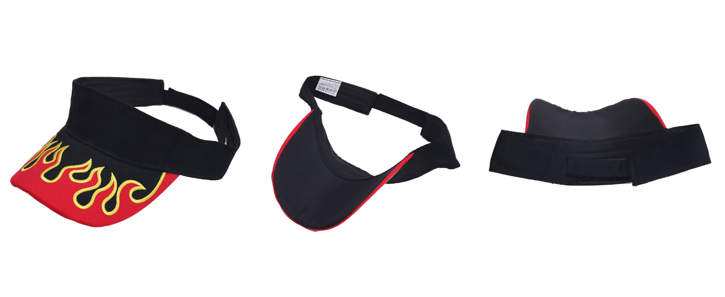 Features: Designed with a bold red flame embroidery and a hollow top for ventilation, golf visors for men include an adjustable Velcro closure to ensure a secure, personalized fit