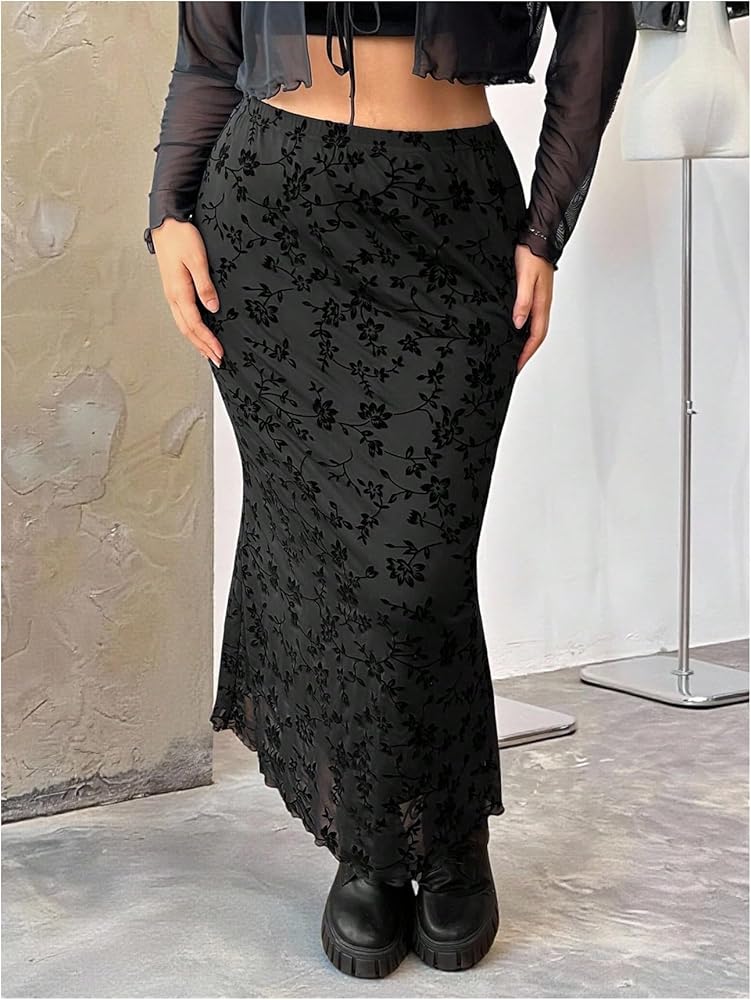 Women's Plus Size Y2k Floral Fishtail Long Skirt Vintage Mesh High Waisted Bodycon Skirts