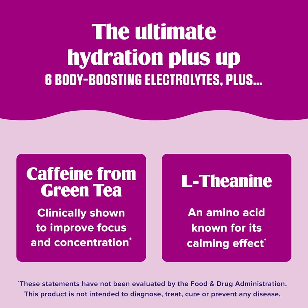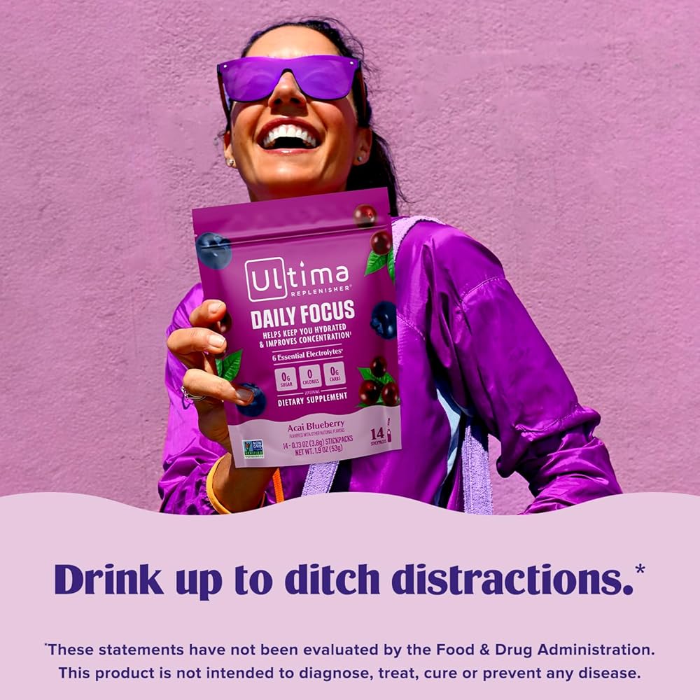 مكمل التركيز اليومي Ultima Replenisher ومسحوق الإلكتروليتات - Acai Blueberry، 14 عبوة لاصقة - عبوات ترطيب، 60 مجم كافيين من مستخلص الشاي الأخضر وL-الثيانين لتحسين التركيز والتركيز