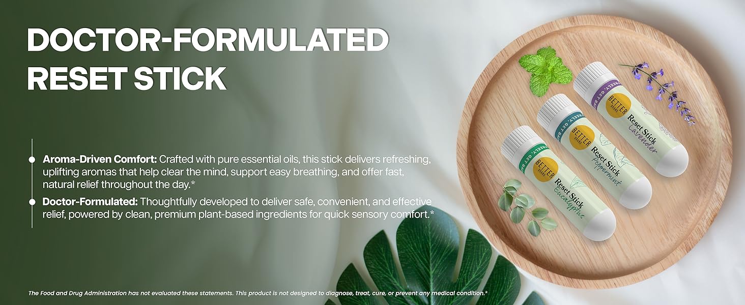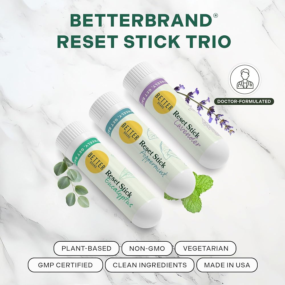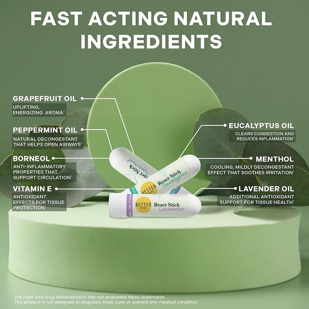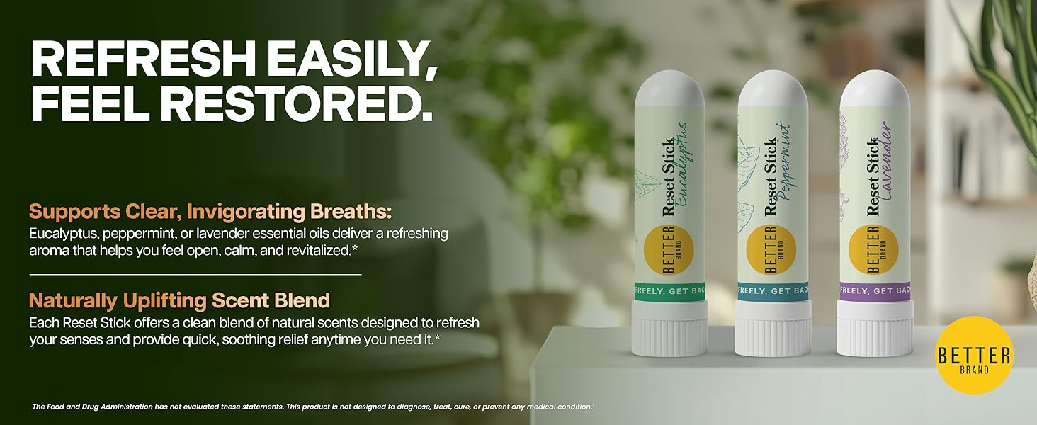 مجموعة عصا إعادة الضبط الثلاثية من Betterbrand - جهاز استنشاق طبيعي للأنف لتخفيف الاحتقان، والنعناع والأوكالبتوس والعلاج العطري باللافندر، غير طبي، ودعم الجيوب الأنفية مناسب للسفر - عبوة من 3 قطع