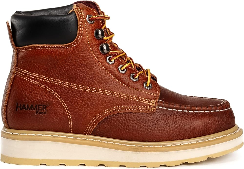 Step into durability and all-day comfort with the Hammer Force Moc Toe Work Boot. Built for hardworking men who demand style, strength, and support, these boots combine premium materials with rugged performance. The rich, oil-tanned leather upper delivers both resilience and timeless appeal, while the moc toe design adds a classic touch perfect for work or casual wear. Crafted with a cushioned wedge outsole, these boots provide exceptional shock absorption and slip resistance, keeping you steady on a variety of surfaces. Reinforced metal eyelets and speed hooks ensure a secure fit, while the padded collar adds extra ankle comfort during long hours on your feet. Whether you are on the jobsite, in the shop, or out for the weekend, the Hammer Force Moc Toe Boot is built to last and designed to keep you comfortable through every step.