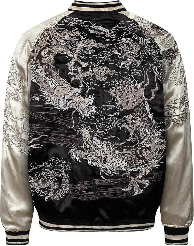 تطريز فريد: تتميز هذه السترة الرجالية بتصميم تطريز التنين. عملية التطريز عالية الكثافة تجعل نمط التنين حيويًا ومتينًا. يأتي تطريز التنين من التقاليد الصينية واليابانية، مما يرمز إلى السلطة والشجاعة والحظ السعيد.