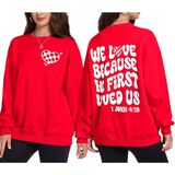 Features: Valentines vibes sweatshirt, christian valentine shirt, womens christian sweatshirts, valentines love heart sweatshirt, we love because he first loved us letter print sweatshirt