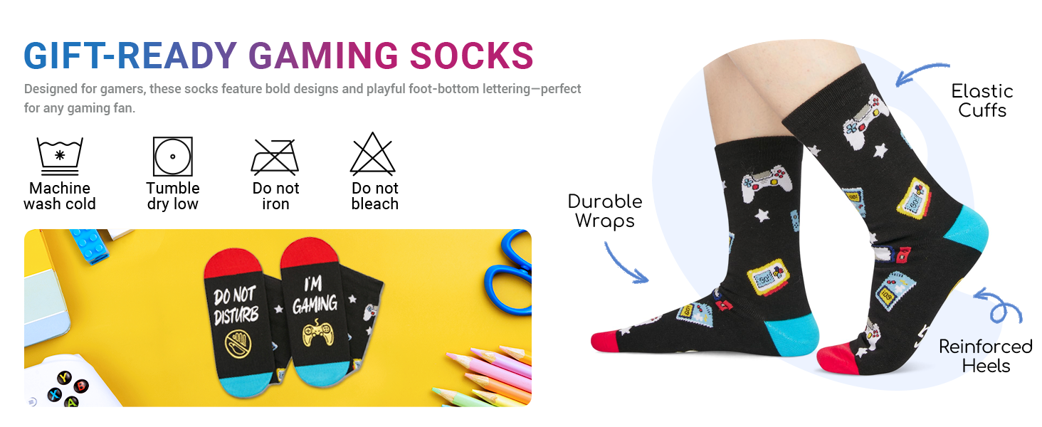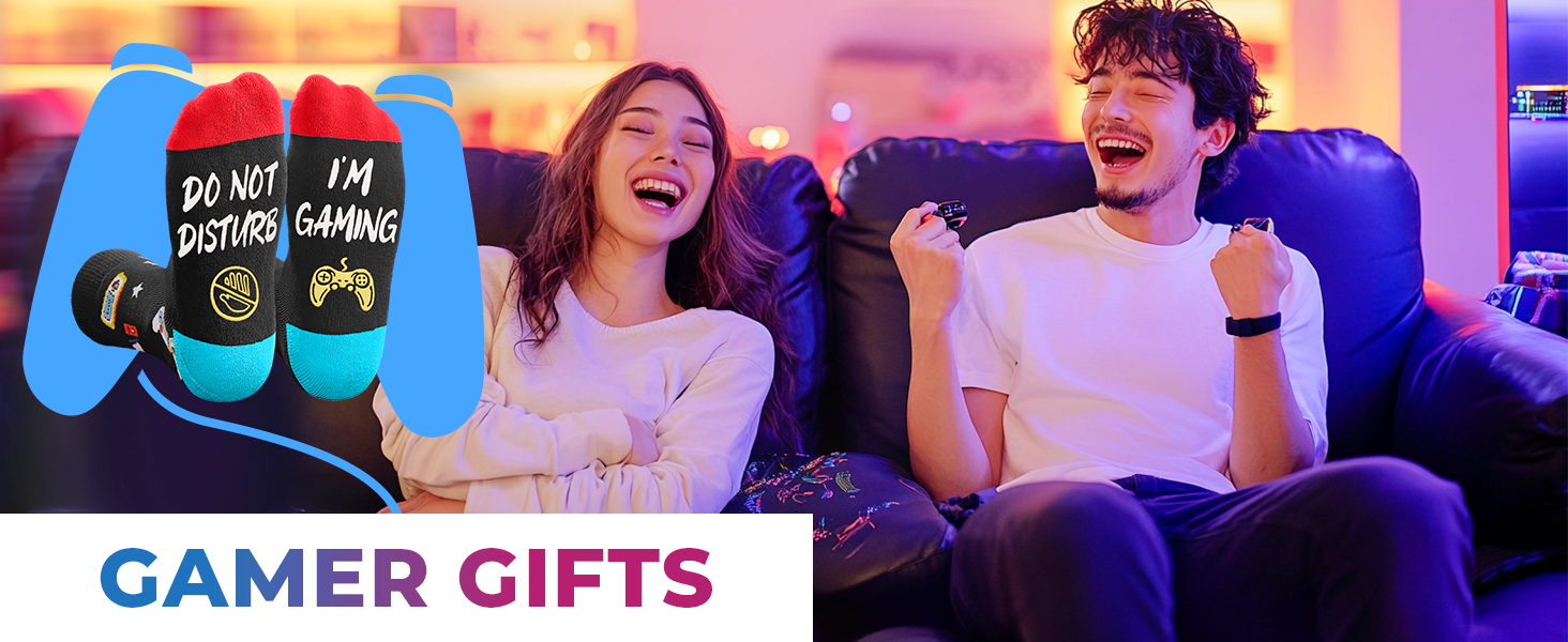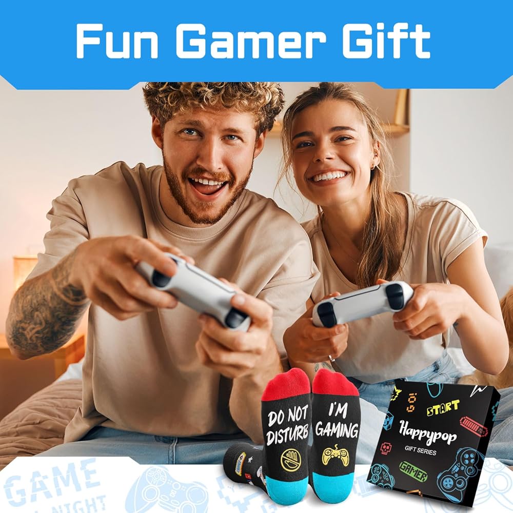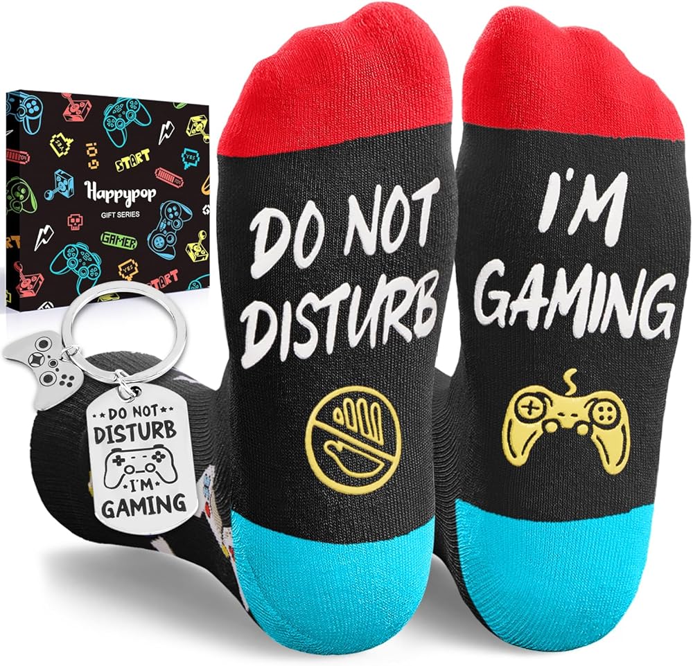• جوارب الألعاب: ألقِ نظرة على هذا الزوج من جوارب الألعاب السوداء الذي يتميز بلوحة ألعاب، بالإضافة إلى مقولة مضحكة، "DO NOT DISTURB I'M GAMING". علاوة على ذلك، يأتي هذا الزوج من الجوارب مع سلسلة مفاتيح لعشاق الألعاب.