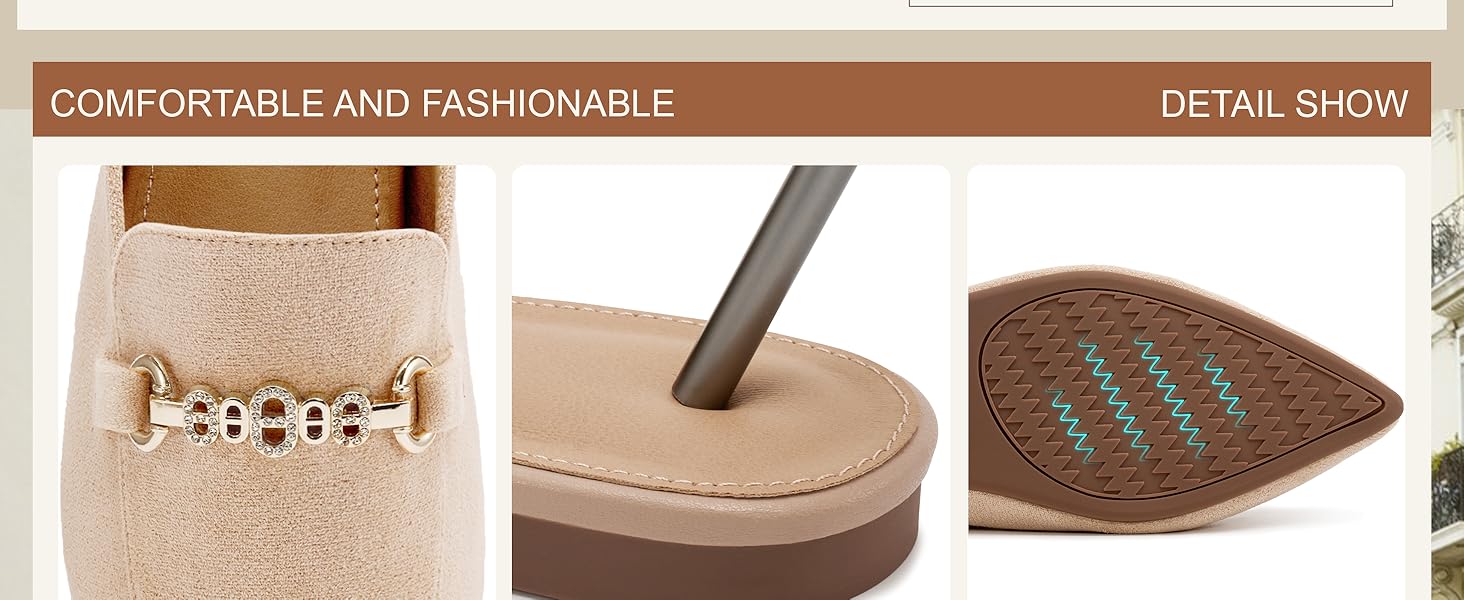 التصميم: إبزيم أنيق من حجر الراين اللامع وتصميم مدبب عند الأصابع يظهر أسلوبًا أنيقًا. التصميم سهل الارتداء يجعل من السهل ارتداء الأحذية النسائية وخلعها، ويمزج بين الموضة والراحة للحصول على مظهر عصري