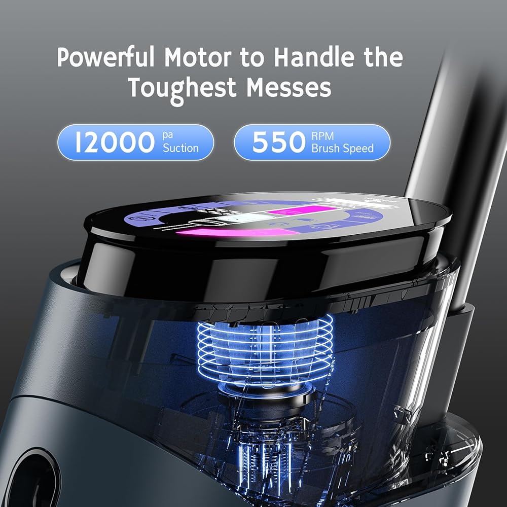 🔹شاشة رقمية ذكية ومساعد صوتي: مع شاشة LCD كاملة الحجم قابلة للمس مع مساعد صوتي مفيد توفر حالة العمل في الوقت الفعلي والتحكم في التنظيف، بما في ذلك مستويات الأوساخ والبطارية وقوة الشفط والتحذيرات بشأن أعطال الميزات. يمكن كتم صوت المساعد الصوتي في الخيارات.