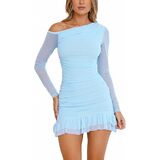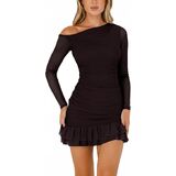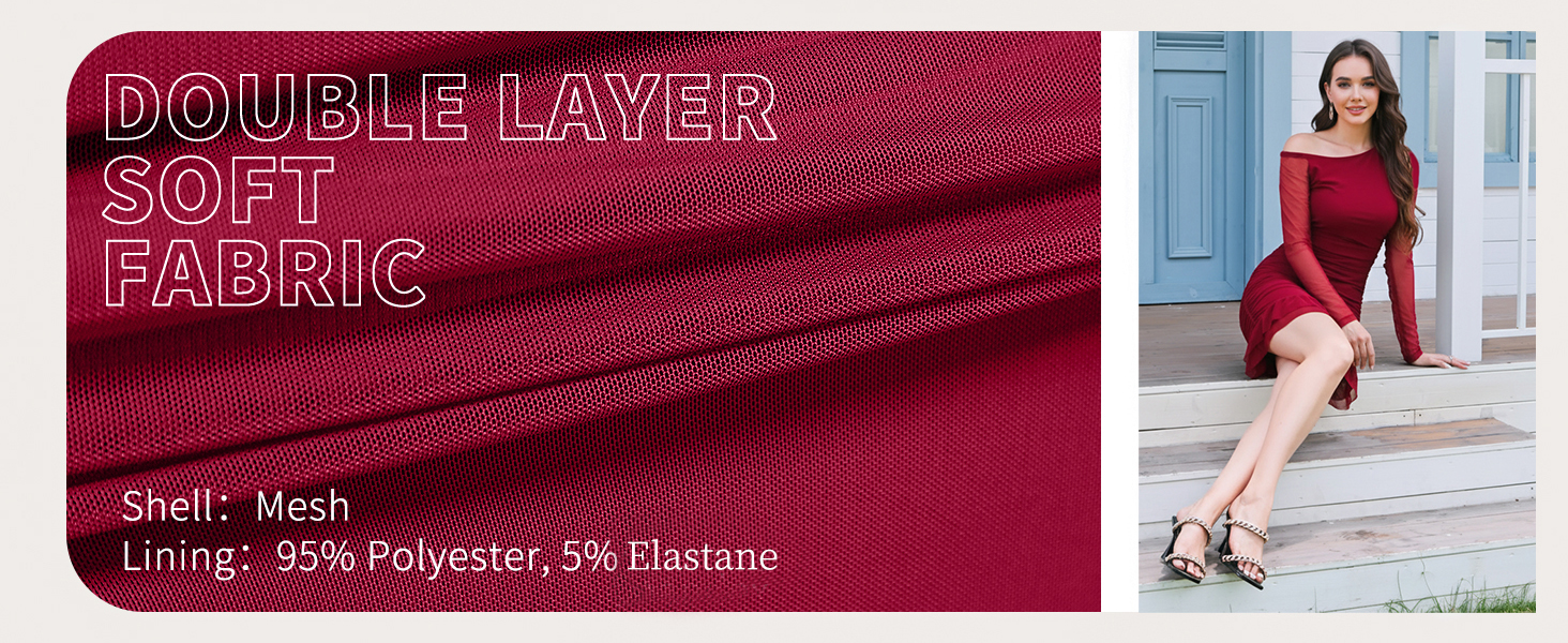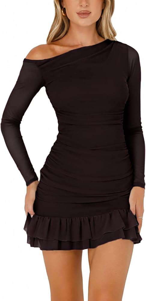 【Features】Off the shoulder dresses for women,long sleeve bodycon dress, mesh dress for women,ruched dresses for women,ruffle hem,sexy mini short bodycon dress,cocktail party club short dress.