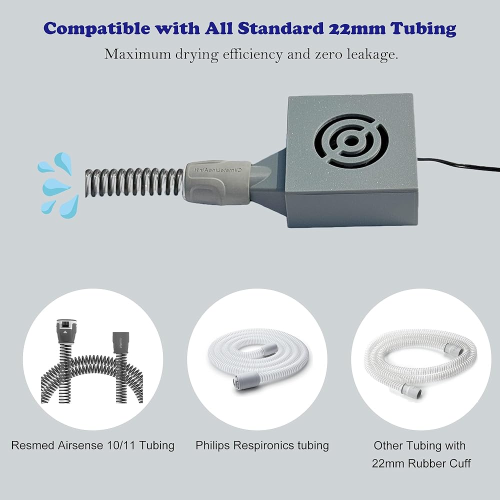 Stop waiting around for your hose to air dry. Theradaily CPAP hose dryer features an Upgreaded hydraulic bearing blower with stronger airflow, blowing water out of the tubing much faster. It dries the tubing in as little as 30 minutes without damaging it. Designed for perfect compatibility with all standard 22mm tubing (including Resmed Airsense 10/11 machine Tubing, Philips Respironics tubing, etc). Our cpap hose dryer for resmed creates an airtight connection with any 22mm tubing, ensuring all airflow is delivered through the tubing for maximum drying efficiency and zero leakage. No more praying for wet tubing to dry before bed. This upgraded cpap tube dryer fan is designed for superior performance, featuring a larger, more powerful blower that is both quiet and efficient. Achieve a completely dry CPAP tube in just 20-35 minutes, not hours, making your cleaning routine faster and more efficient. Maintain your CPAP hose cleaning routine without any hassle. Our cpap cleaner blower is compact and lightweight, easily fitting into any travel bag, suitcase, or even a large pocket. No more waiting for hoses to air dry while traveling. Just plug it in for a quick dry anytime, anywhere, ensuring you always have a clean, dry hose for a good night's sleep. This cpap dryer machine comes with a 1-year warranty. If you encounter any problems with the product during this period, please contact us through Amazon. We promise to solve your problems well.