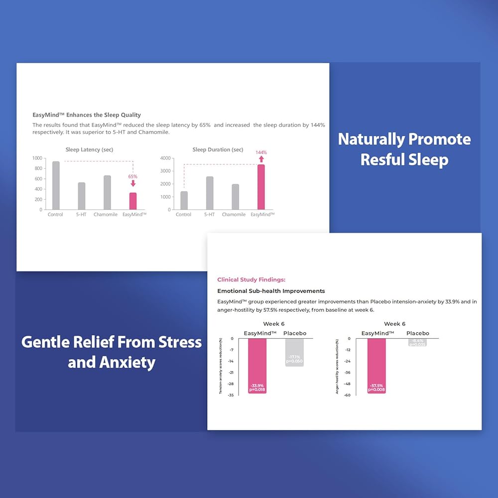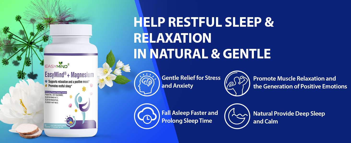 مساعد النوم الطبيعي EasyMind الحاصل على براءة اختراع: مزيج EasyMind الحاصل على براءة اختراع مع أكسيد المغنيسيوم والجليسينات يساعد على النوم المريح والاسترخاء بشكل طبيعي ولطيف. تساعدك على النوم بشكل أسرع، والبقاء نائماً لفترة أطول. يوفر نومًا عميقًا وهدوءًا بشكل طبيعي، ويستيقظ منتعشًا، بدون الميلاتونين