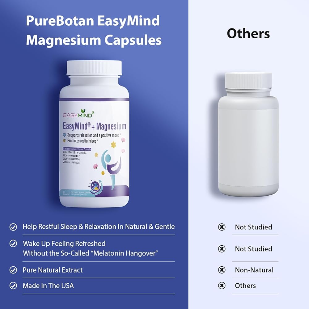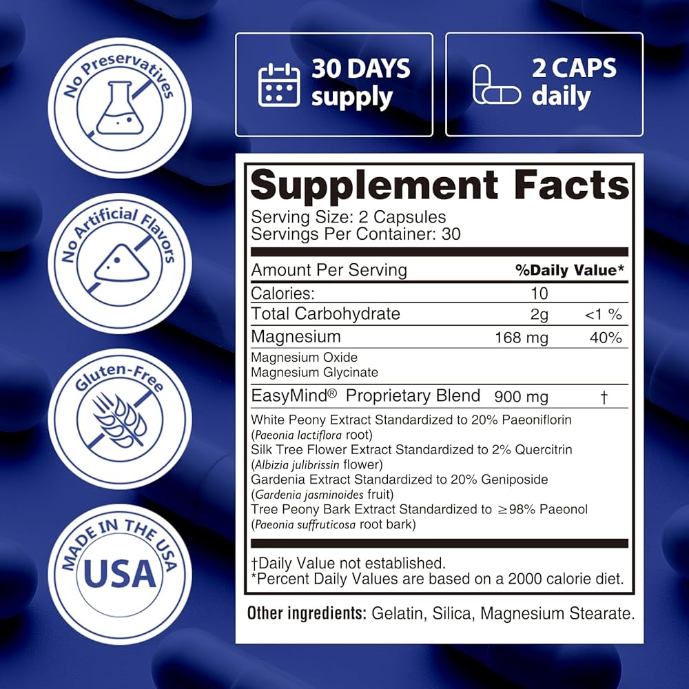تخفيف التوتر اللطيف: يساعد مكمل المغنيسيوم للمساعدة على النوم مع مستخلص نباتي حاصل على براءة اختراع EasyMind، على تخفيف التوتر بلطف، وتعزيز توليد المشاعر الإيجابية. تعمل كبسولات أكسيد المغنيسيوم والجليسينات على تعزيز استرخاء العضلات، وتوفير الراحة الجسدية من الانزعاج المرتبط بالقلق