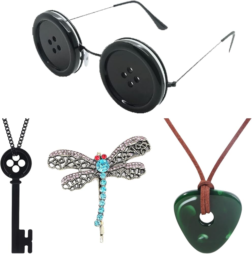 مجموعات إكسسوارات قلائد تنكرية مكونة من 4 قطع للحفلات التنكرية - قلادة على شكل زر عيون ترى حجرًا على شكل يعسوب ومشبك شعر مفتاح أسود - للنساء والرجال لتزيين حفلات الهالوين وهدايا أعياد الميلاد (D)
